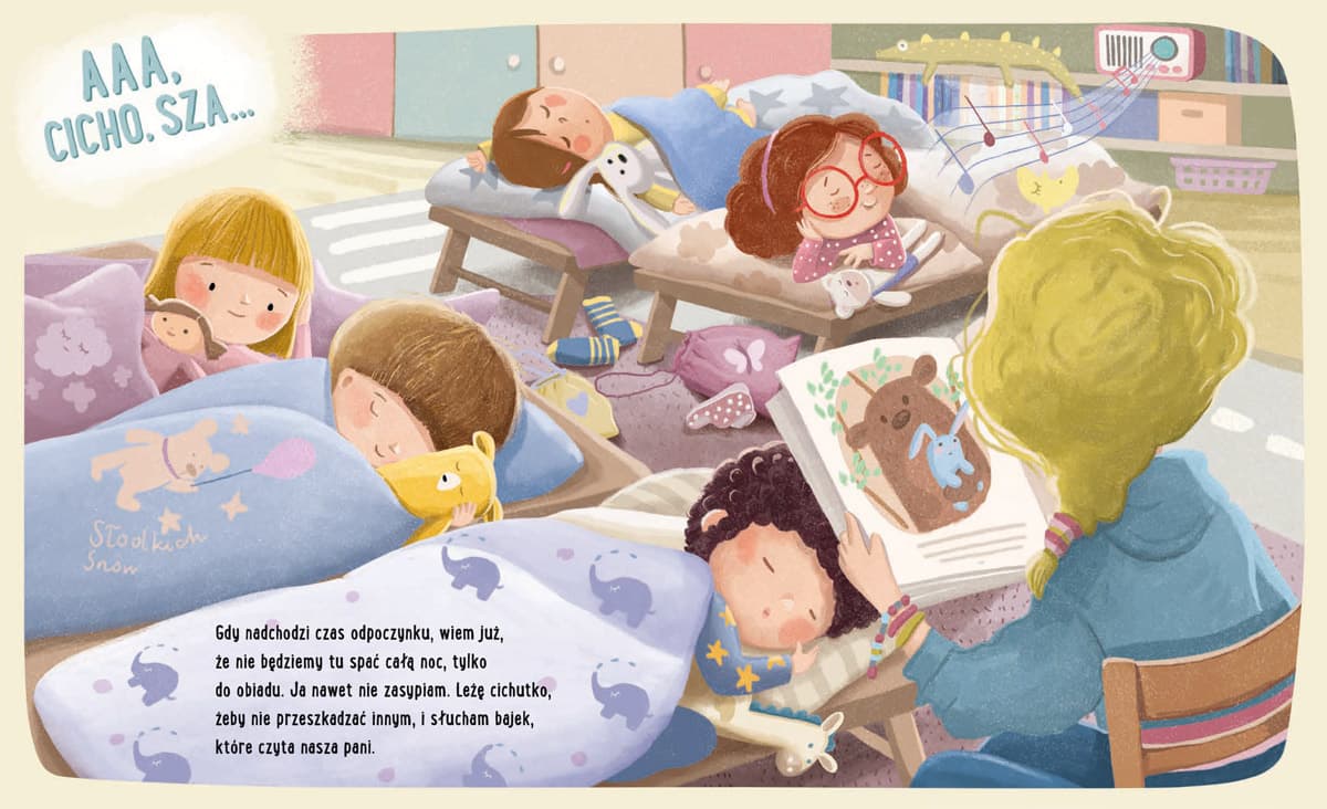 Jeśli zbliża się moment, w którym i Wasze dziecko pójdzie do przedszkola, ta książeczka pomoże całej rodzinie oswoić się z nową sytuacją. Ciepłe i pogodne ilustracje pokazujące wnętrze przedszkola i wybrane chwile z przebiegu dnia zachęcą do radosnego wyczekiwania, a wspólne czytanie stanie się pretekstem do rozmów. Dzięki temu Wasze dziecko będzie spokojniejsze i z radością powita nowych kolegów.