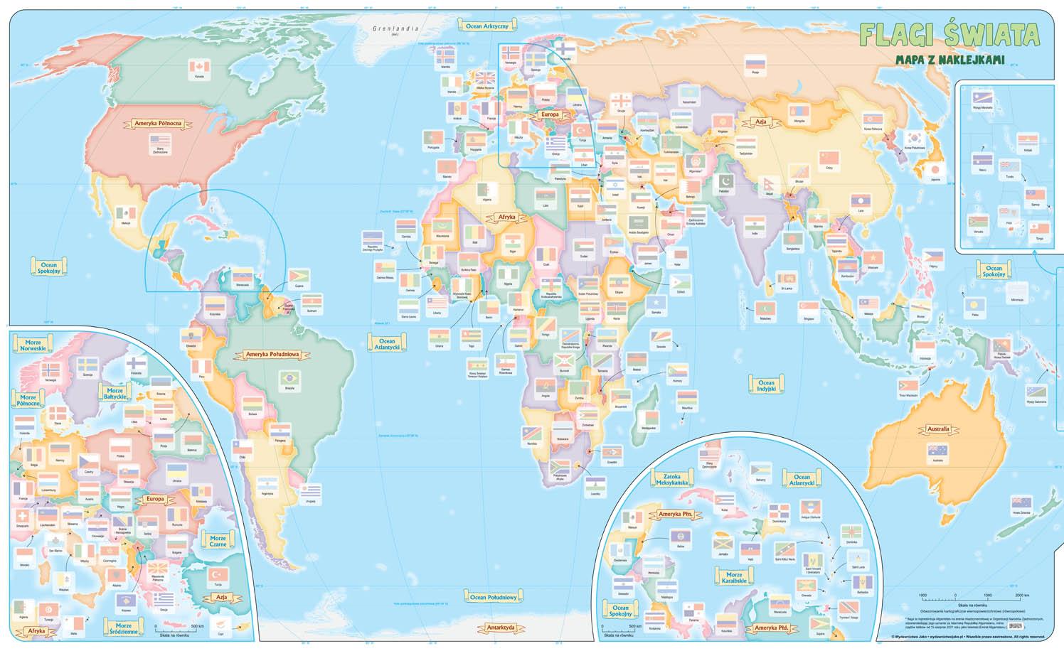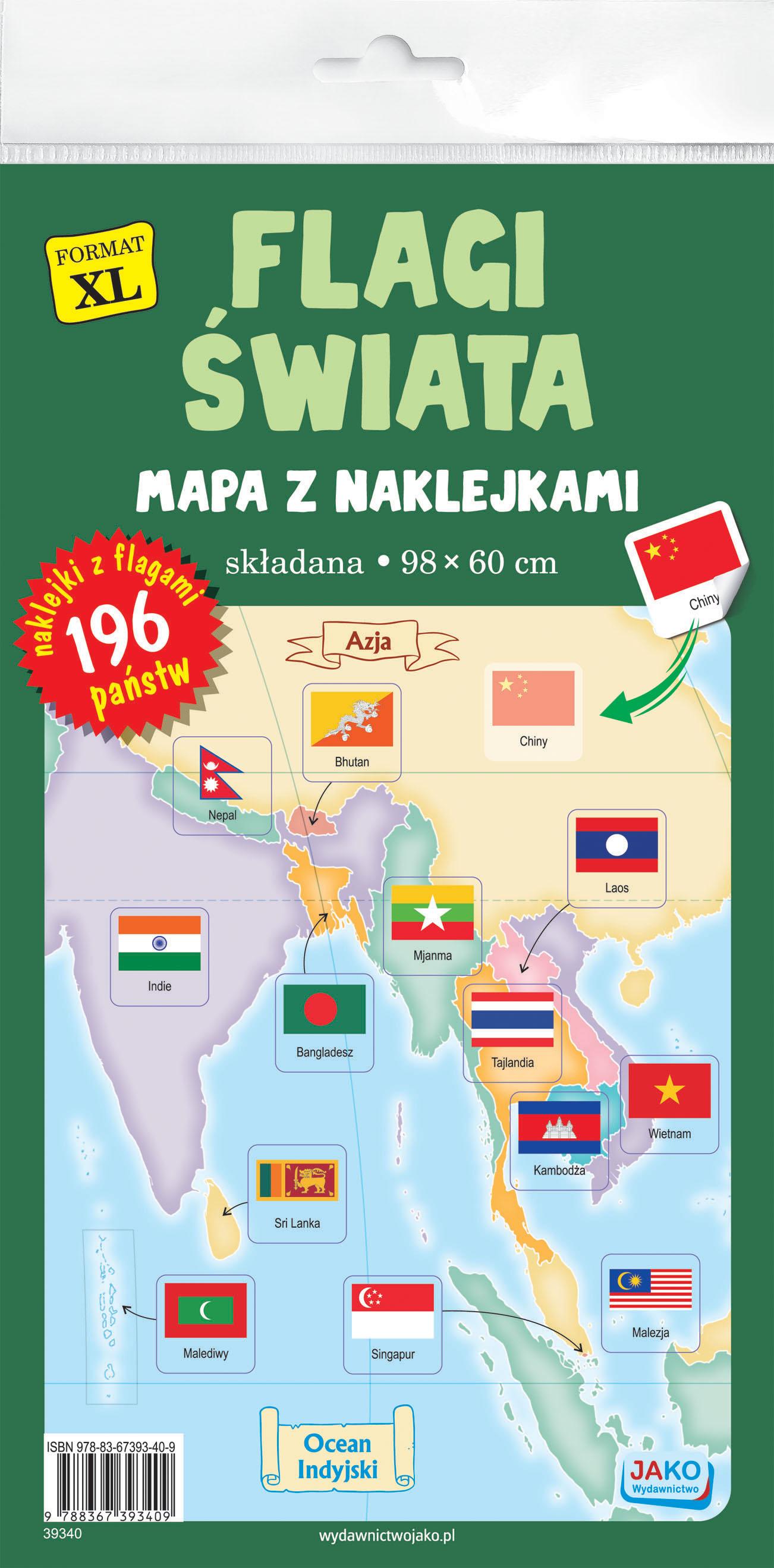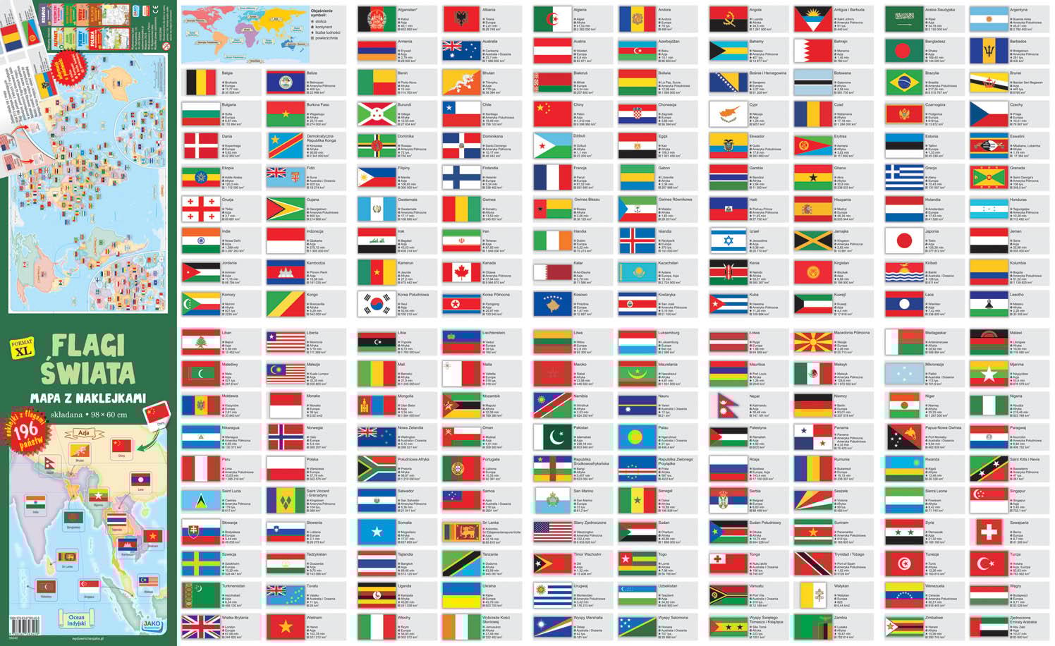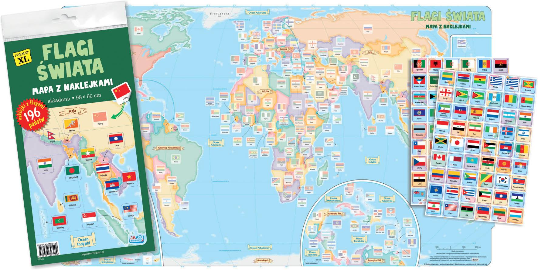 Dzięki tej pozycji dzieci mogą nie tylko poznać flagi wszystkich państw, lecz także dowiedzieć się, gdzie poszczególne kraje znajdują się na mapie świata. Zestaw składa się z mapy oraz 213 naklejek (zawierających flagi 196 państw, z których 17 występuje podwójnie, ponieważ są stosowane także w powiększonych fragmentach mapy). Naklejki zawierają flagę i nazwę państwa. Należy znaleźć na mapie przypisane do danego kraju miejsce i wkleić naklejkę. Na odwrocie mapy umieszczono dodatkowe informacje o państwach, takie jak: stolica, kontynent, liczba ludności i powierzchnia. Mapa uzupełniona naklejkami świetnie się sprawdzi jako edukacyjny plakat na ścianę.