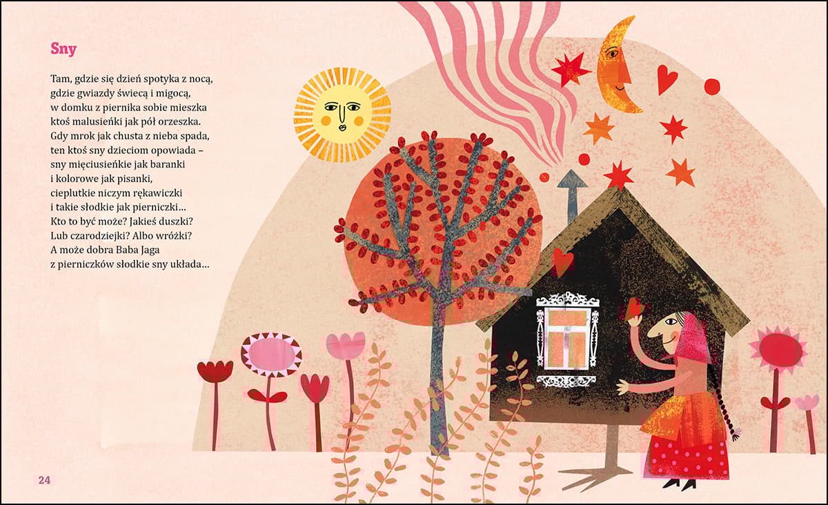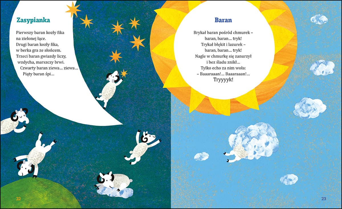 Zupełnie nowe wydanie – znacznie rozszerzone i tym razem zilustrowane przez Agnieszkę Żelewską – bestsellerowej książki, którą pod tytułem „Wiersze do poduchy” dekadę temu poznało i pokochało wiele maluszków, ich mam i tatusiów. Wiersze i wierszyki do czytania na dobranoc, do snu, do poduszki i… przez cały dzień. Pełne pogodnego humoru rymowane opowiastki napisane przez znaną i lubianą poetkę, Małgorzatę Strzałkowską. W rytmie kołysanek przeniosą maluszka do zaczarowanej krainy wyobraźni, ułatwią zaśnięcie i sprowadzą „sny mięciutkie jak baranki”… Śpi już niedźwiedź i motylek. Na dnie szafy drzemie duszek. Ziewa pająk. Kot przeciąga się leniwie… „Sen po dachu chodzi, kołysankę śpiewa”. Liczymy barany, liczymy bałwany… i zasypiamy. A „dobra Baba Jaga z pierniczków słodkie sny układa”. Książka wpisana na Złotą Listę „Cała Polska czyta dzieciom”.