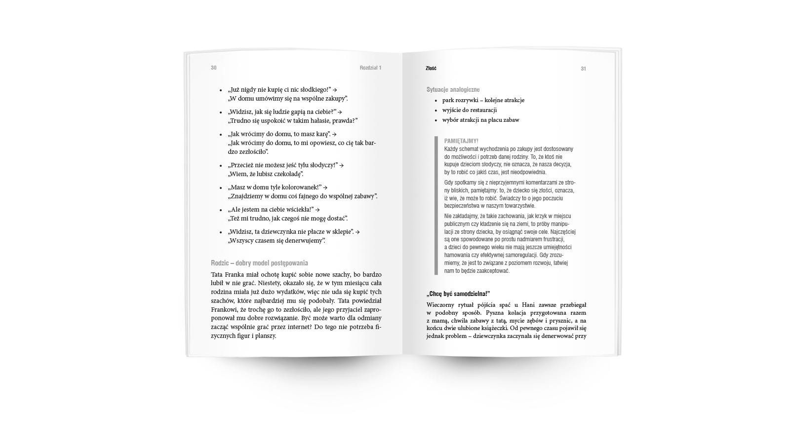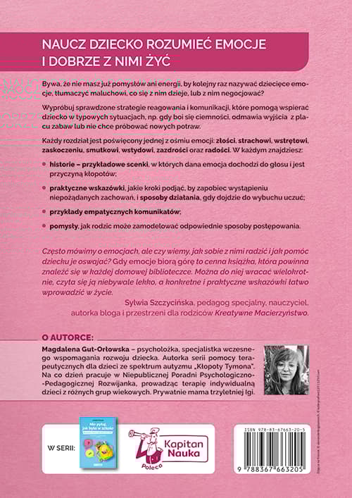 Twoje dziecko ze strachu odmawia wejścia do gabinetu lekarskiego? Nie chce próbować nowych potraw? Boi się samo zasypiać? W tym poradniku znajdziesz typowe sytuacje, które mogą się przydarzyć rodzicom przedszkolaków: ataki złości w sklepie, strach przed ciemnością, niefortunne komentarze czy niechęć do przytulania się. Każdy rozdział poświęcony jest jednej emocji. A w nim znajdują się badania dotyczące tej emocji w kontekście jej rozwoju u dzieci, historie – zdarzenia, w których ta emocja dochodzi do głosu i jest przyczyną kłopotów, a także praktyczne wskazówki, jakie kroki podjąć, by zapobiec wystąpieniu różnych zachowań lub sposoby działania, gdy emocja pojawi się u dziecka. Rodzice małych dzieci znajdą w nim również przykłady empatycznych komunikatów, które warto kierować do dziecka, a także sytuacje, w których rodzic może zamodelować odpowiednie sposoby radzenia sobie z emocją. Magdalena Gut-Orłowska, psycholog dziecięca, wyjaśnia, że nie jest łatwo rozmawiać z dziećmi o emocjach. Czasami nawet trudno nazwać, co czują w danej sytuacji, ale im więcej pokażemy dzieciom sposobów radzenia sobie z emocjami, tym lepiej będą one rozumiały, co się z nim dzieje, i lepiej radziły sobie w nowych okolicznościach. O autorce: Magdalena Gut-Orłowska – psycholożka, specjalistka wczesnego wspomagania rozwoju dziecka. Autorka serii pomocy terapeutycznych dla dzieci że spektrum autyzmu "Kłopoty Tymona". Na co dzień pracuje w Niepublicznej Poradni Psychologiczno Pedagogicznej Rozwijanka, prowadząc terapię indywidualną dzieci z różnych grup wiekowych. Prywatnie mama trzyletniej Igi.