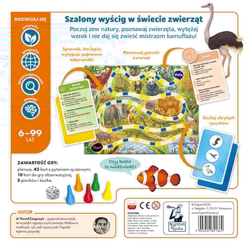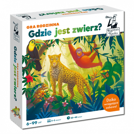 Poczuj zew natury, poznawaj zwierzęta, wytężaj wzrok i nie daj się zwieść mistrzom kamuflażu! Gdzie jest zwierz? to rodzinna gra planszowa, która zapewni szalony wyścig w świecie zwierząt. Sprawdźcie, co wiecie o różnych gatunkach, poznajcie zwierzęcych rekordzistów oraz ciekawostki dotyczące ich życia. Typujcie poprawne odpowiedzi na pytania quizowe i szukajcie na planszy ukrytych zwierzaków. Co robi modliszka? Ile litrów wody może wypić jednorazowo wielbłąd dwugarbny? Czy miś koala spokrewniony jest z niedźwiedziem? Duzi i mali tropiciele tajemnic przyrody odkryją gatunki owadów, ssaków, płazów, gadów, ptaków oraz ryb. Dowiedzą się więcej o ich niezwykłych umiejętnościach, budowie i wyglądzie. W drodze po zwycięstwo przydadzą się spryt, refleks i spostrzegawczość. O barwne ilustracje świata zwierząt zadbała Anna Truszkowska. Szczegółowe grafiki zachęcają do poznawania fauny. Plansza i karty zostały wykonane z najwyższej jakości materiałów, co gwarantuje wytrzymałość podczas emocjonujących rozgrywek. Wiek graczy: 6+ Liczba graczy: 2-5 Czas rozgrywki: 20-40 minut