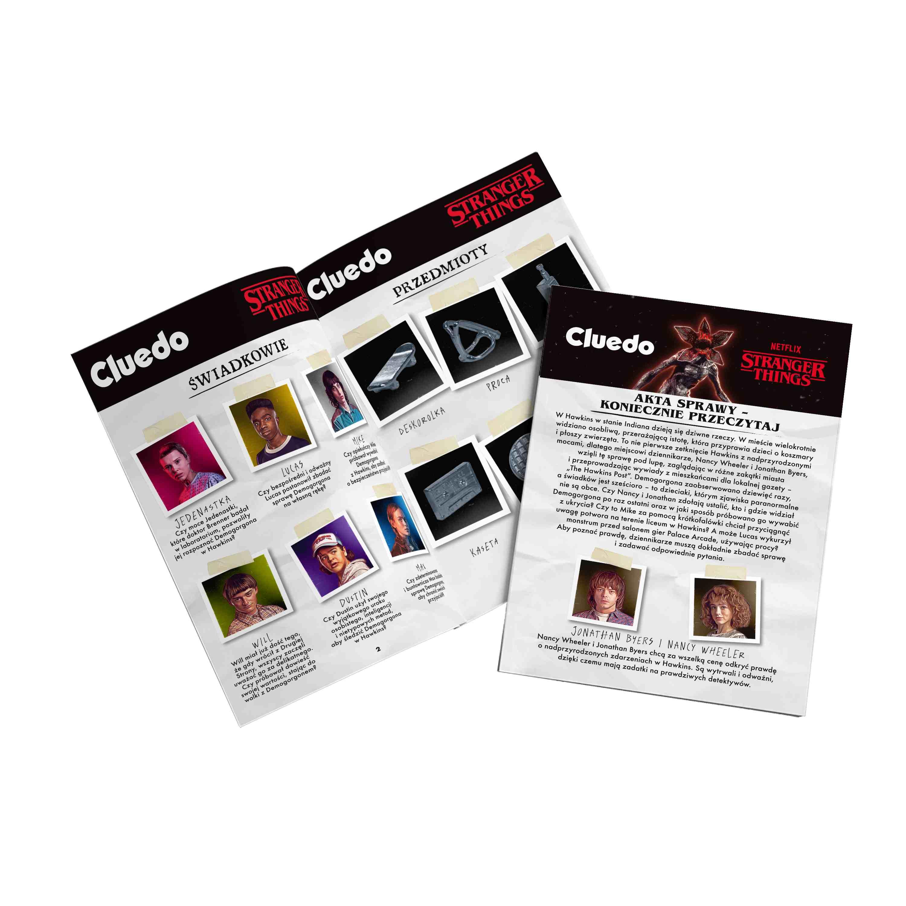 21 kart poszlak (bohaterowie, miejsca, przedmioty), notes deteyktywa, 6 kart Friends Don’t Lie, 15 kart Hawkins Post, 1 koperta Cluedo,