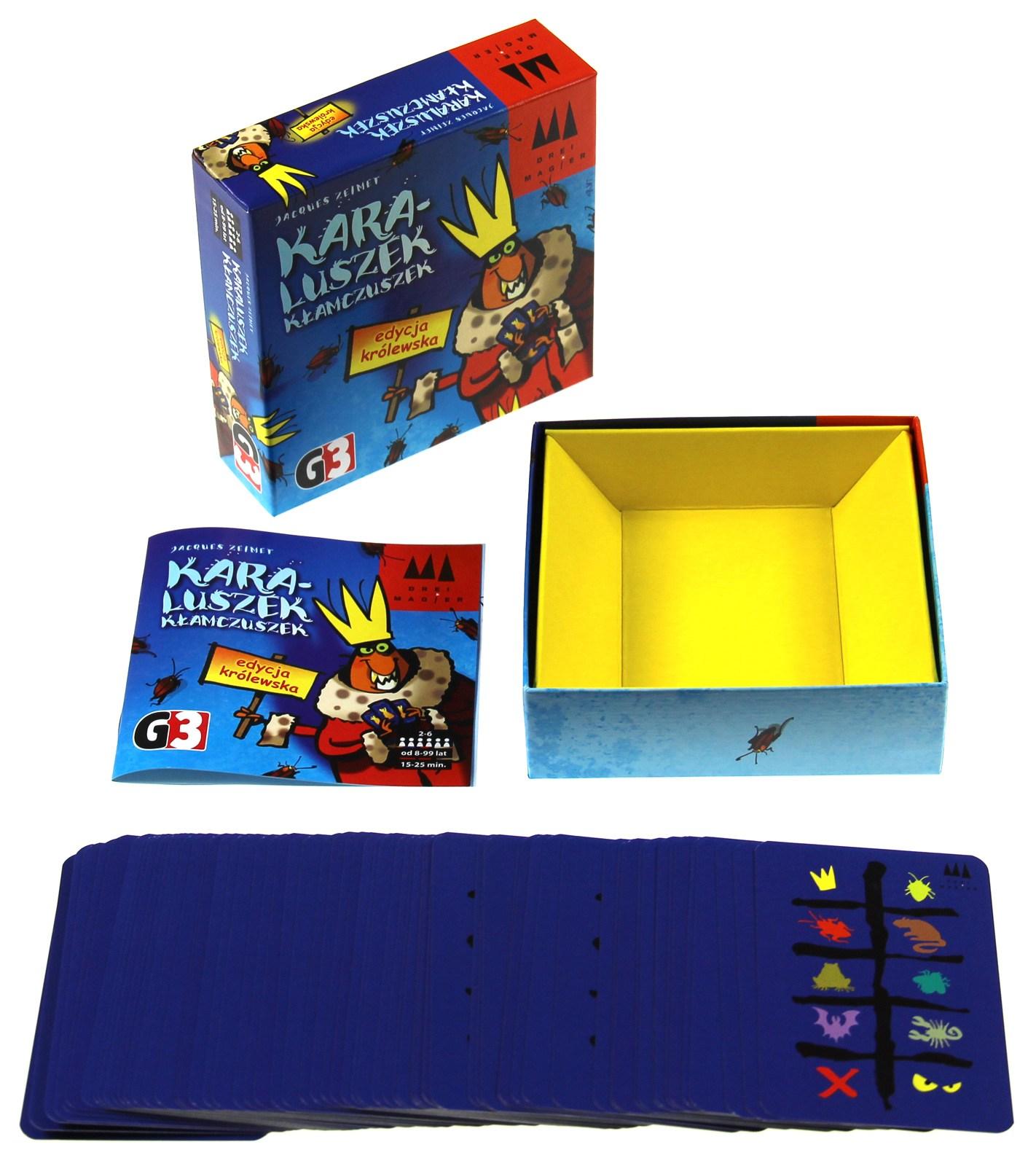 To karaluch? Ropucha? A może karta królewska? Czy przeciwnik mówi prawdę czy blefuje? "Karaluszek kłamczuszek (edycja królewska)" to gra o zwierzakach, których nikt nie lubi. Istotną rolę odgrywa tutaj umiejętność blefowania i obserwacja innych graczy. Sprytne oszukiwanie pozwoli wykiwać przeciwników i wcisnąć im jak najwięcej kart.