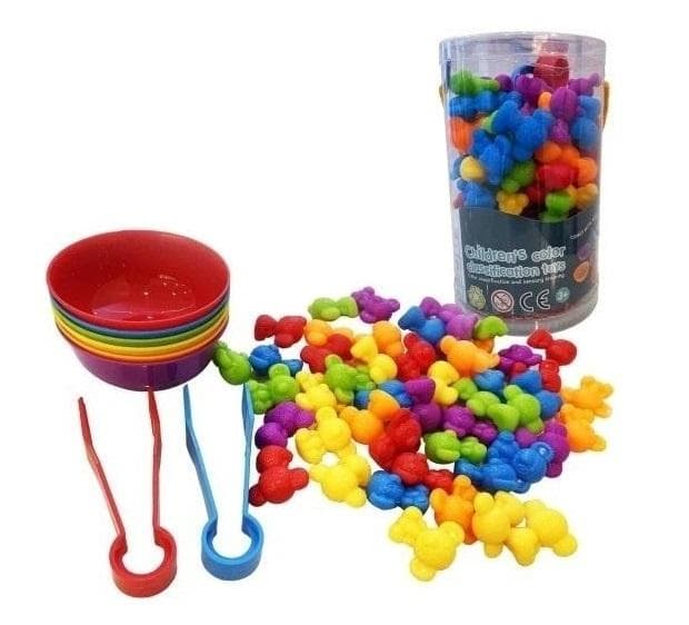 Gra edukacyjna Montessori, koala x 36 rozpoznawanie kolorów i kształtów. W zestawie kolorowe misie, szczypce, kolorowe miseczki do segregowania.