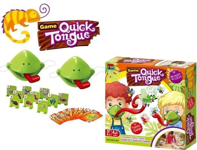 Przygotuj się na salwy śmiechu z grą Quick Tongue, dynamiczną i zabawną grą zręcznościową, w której wcielasz się w kameleona! Dwóch graczy zakłada specjalne maski z ruchomymi "językami", a następnie czeka na rozsypanie kart z wizerunkami owadów. Zadaniem jest jak najszybsze "strzelenie" językiem w odpowiednie karty celu, zanim zrobi to przeciwnik. Wygrywa ten, kto zbierze więcej kart. Quick Tongue to świetny sposób na rozwijanie szybkości reakcji, koncentracji i koordynacji ręka-oko u dzieci. Proste zasady sprawiają, że gra jest idealna dla najmłodszych od 4 roku życia, ale dostarcza rozrywki również dorosłym. Opakowanie zawiera wszystkie elementy potrzebne do rozpoczęcia zabawy: dwie maski kameleona z językami, zestaw kart celów przedstawiających owady oraz talia kart do gry. Zapewnij swojej rodzinie niezapomniane, pełne śmiechu chwile z Quick Tongue!