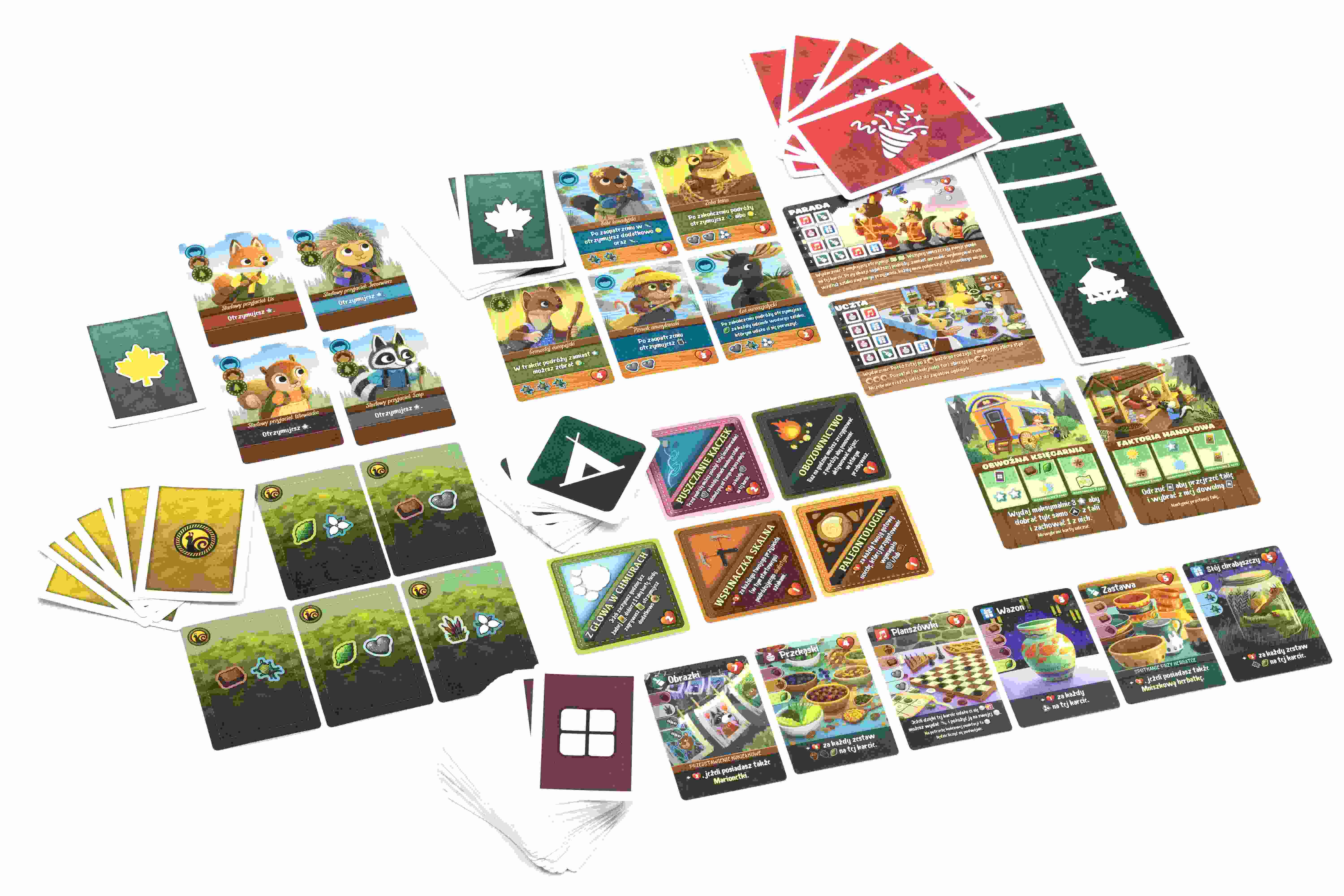– 180 żetonów dóbr (po 18 żołędzi, jeżyn, żerdek, pałki wodnej, gliny, przypraw, miodu, chrabąszczy, kwiatków oraz kamyków)