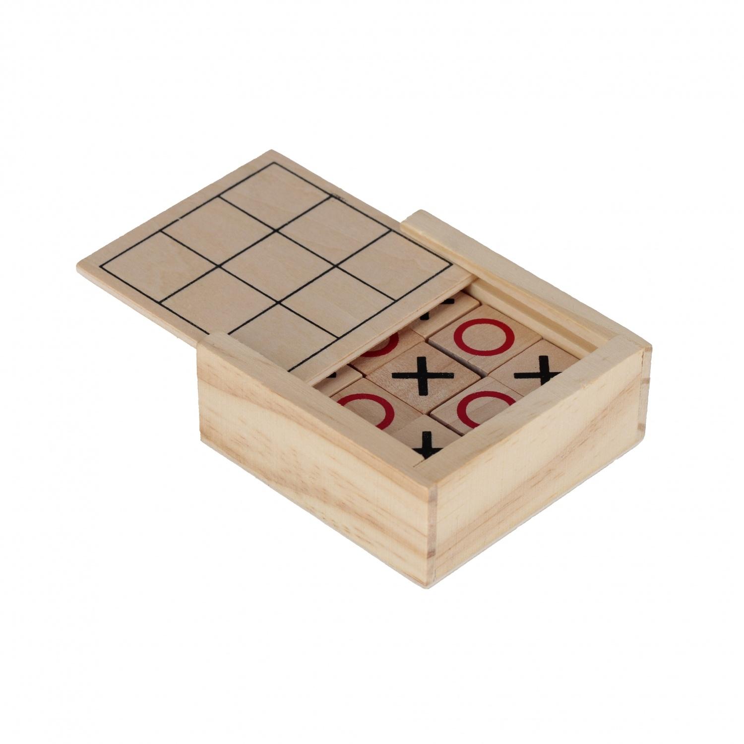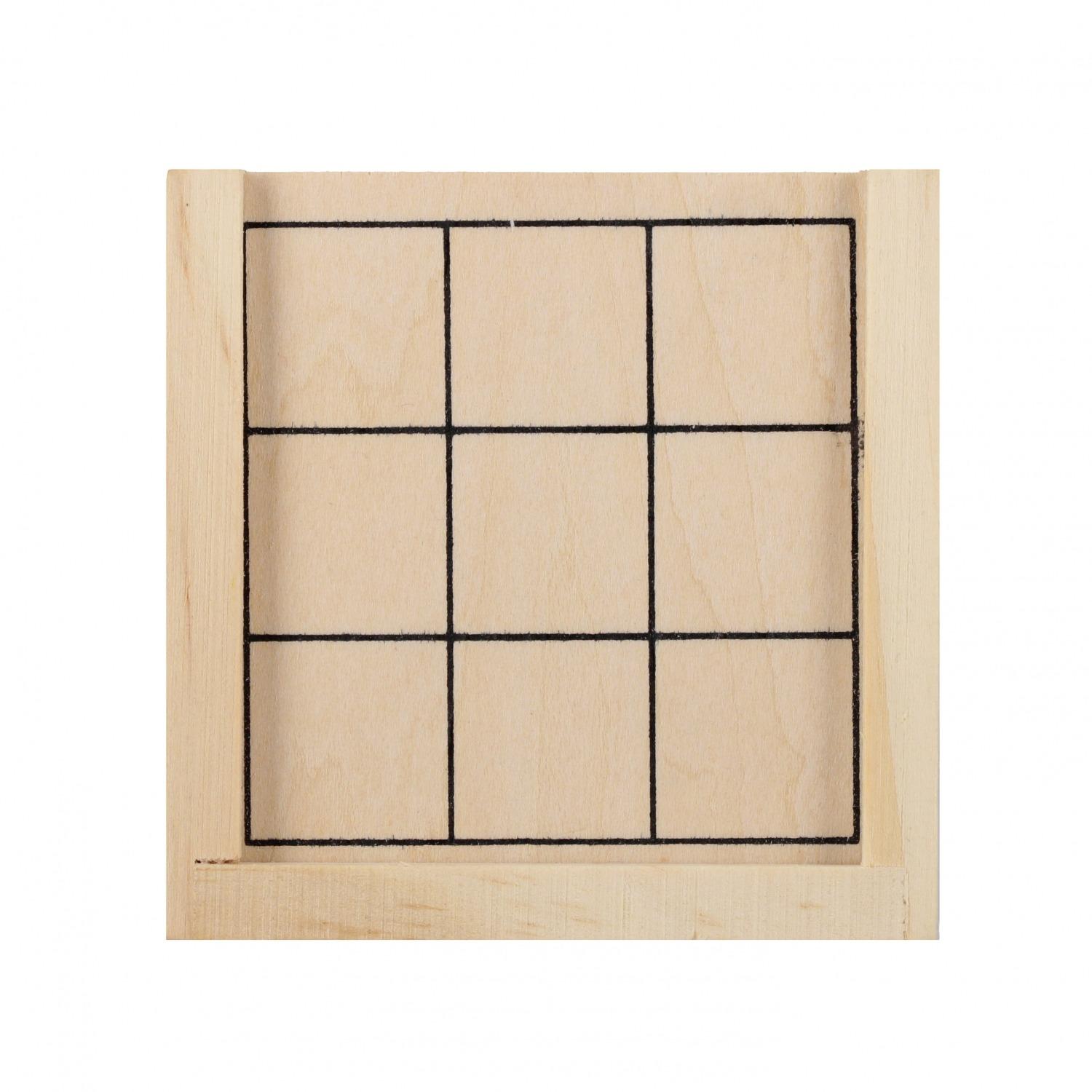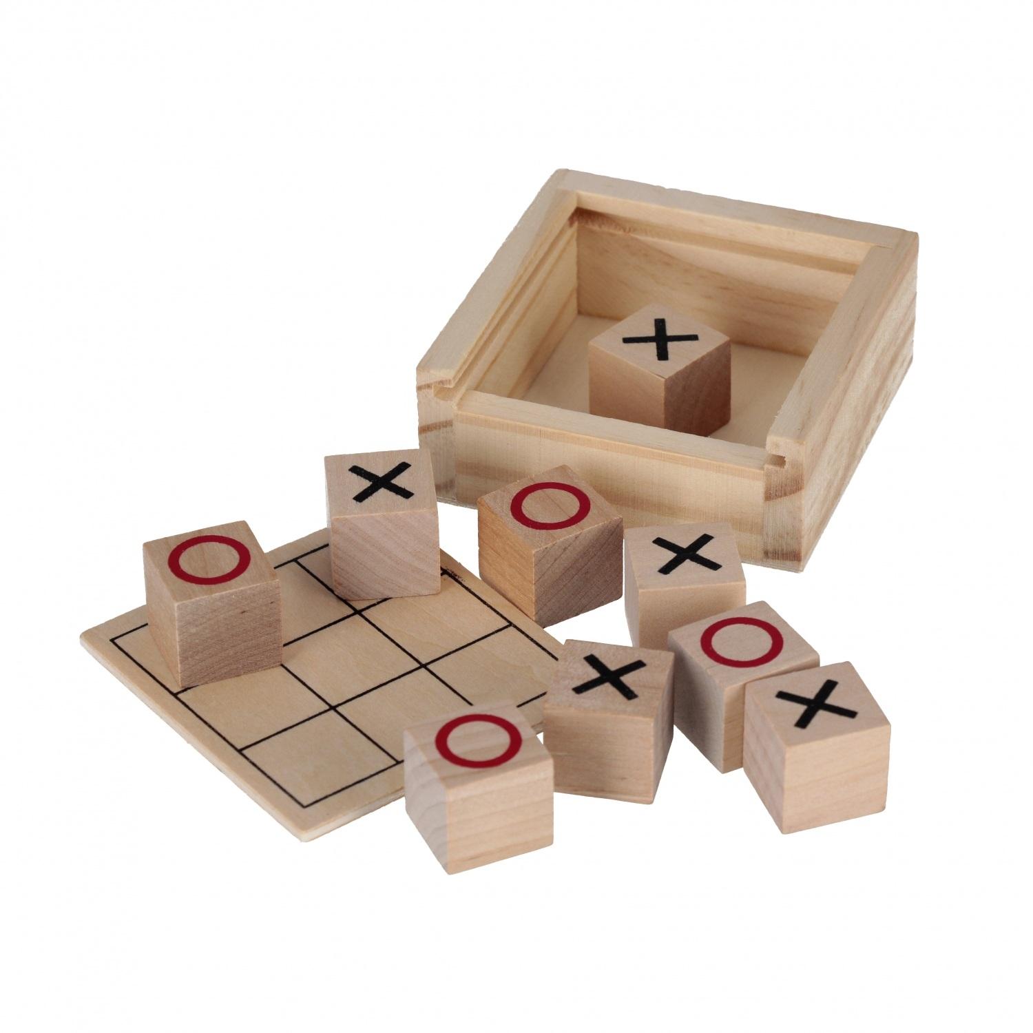 Do dzieła! Zawartość zestawu plansza podzielona na 9 kwadratowych pól, 5 drewnianych kostek w formie krzyżyka i 4 drewniane kostki w formie kółka. Zabawka wykonana z drewna.