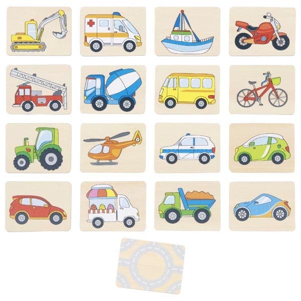 32 drewniane karty z wizerunkami różnych pojazdów. Idealne dla małych fanów motoryzacji, ćwiczą pamięć i refleks.