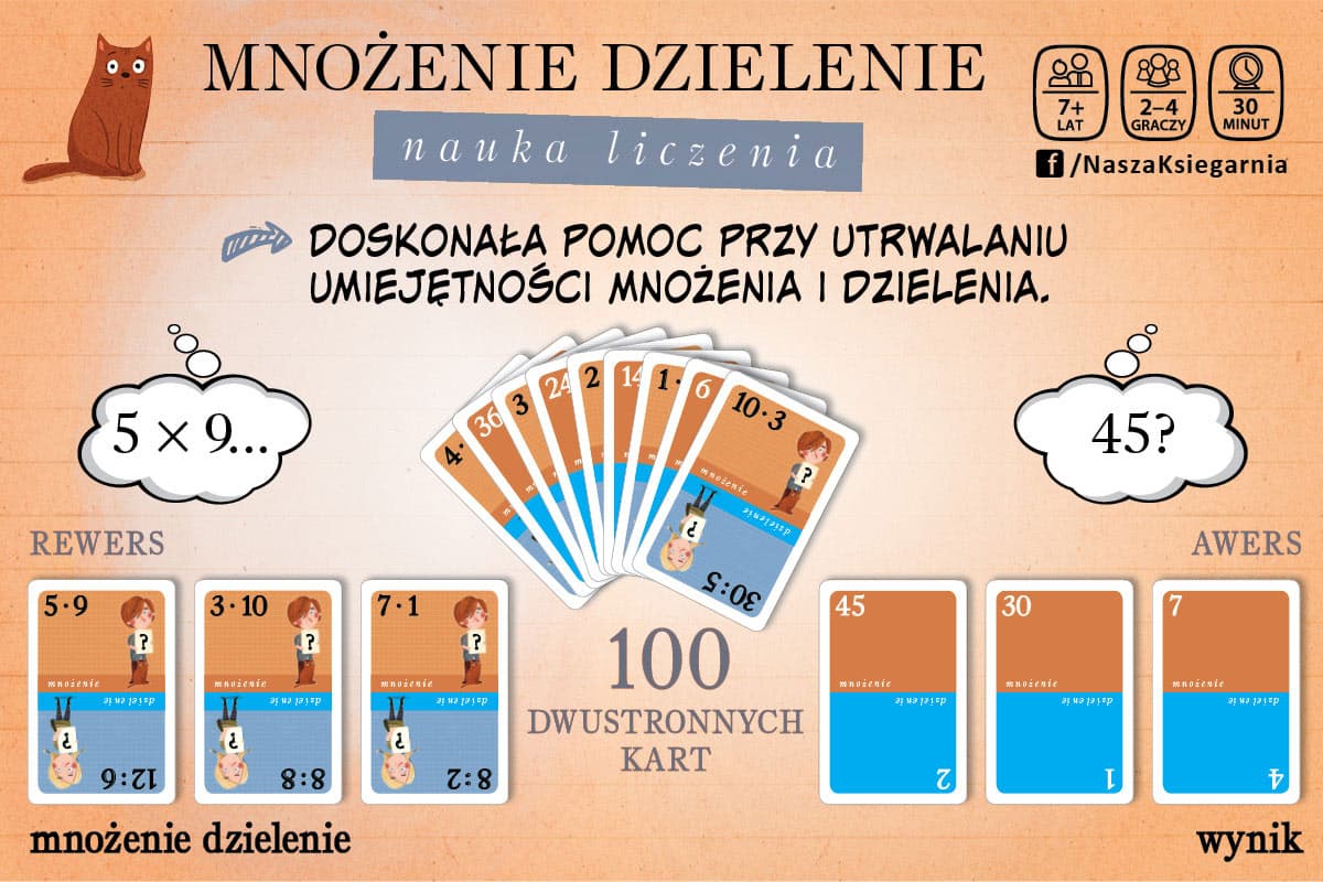 W grze znajdziemy 100 kart, na których znajdują się zarówno działania mnożenia, jak i dzielenia.