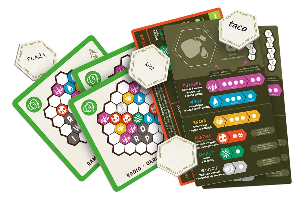 Oprócz tego mapa wskazuje, gdzie znajdują się inne kluczowe obszary wyspy: pułapki, źródła wody, skarby, przeklęte miejsca oraz chroniące przed nimi amulety, a także najważniejszy punkt: wyjście.