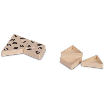 Wersja podróżna, Triominos to gra logiczna, przypominająca klasyczne domino, niemniej gwarantująca znacznie ciekawszą rozgrywkę. Układane elementy mają kształt równobocznych trójkątów z liczbami w narożnikach. Dostawiając kolejny kamień do już ułożonego układu, musimy zadbać o to, by numery w sąsiadujących narożnikach były takie same.