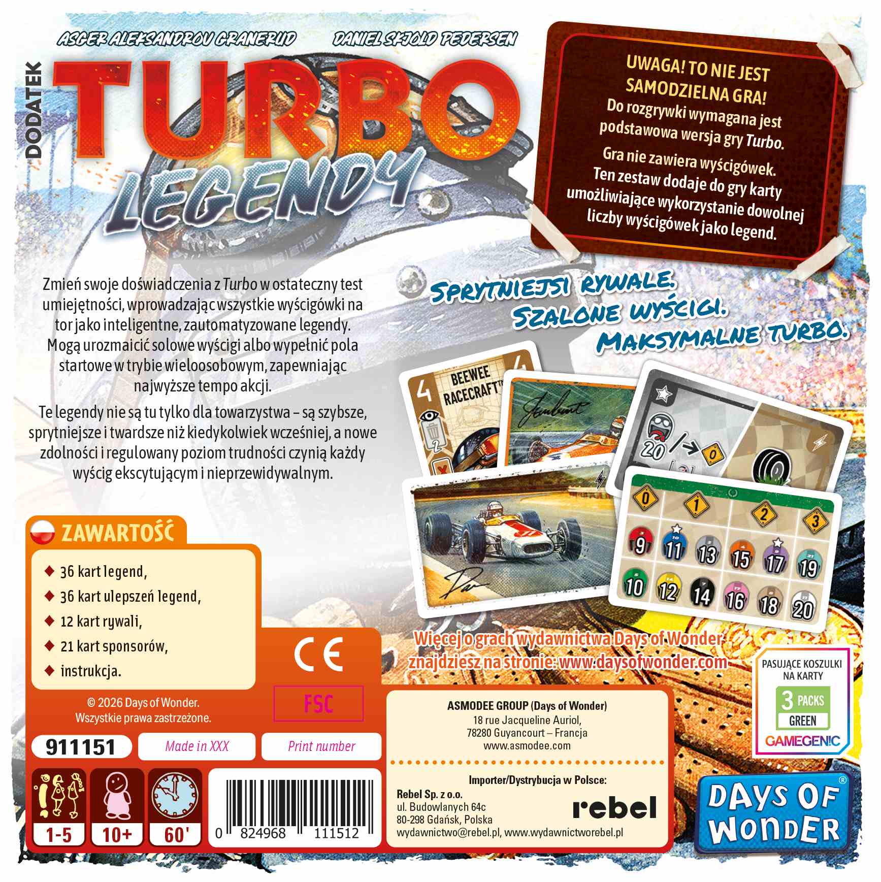 Turbo: Legendy to rozszerzenie wprowadzające do gry nowe karty legend: szybszych, sprytniejszych i twardszych niż kiedykolwiek wcześniej zautomatyzowanych kierowców. Dzięki nim możesz stworzyć unikalne wyzwanie na wybranym poziomie trudności, zarówno w ramach pojedynczego wyścigu, jak i w trybie mistrzostw. Poczuj emocje związane z ekstremalnym sprawdzianem umiejętności, ścigając się z inteligentnymi, zautomatyzowanymi kierowcami w rozgrywkach solo albo wypełniając puste pola startowe w trybie wieloosobowym.