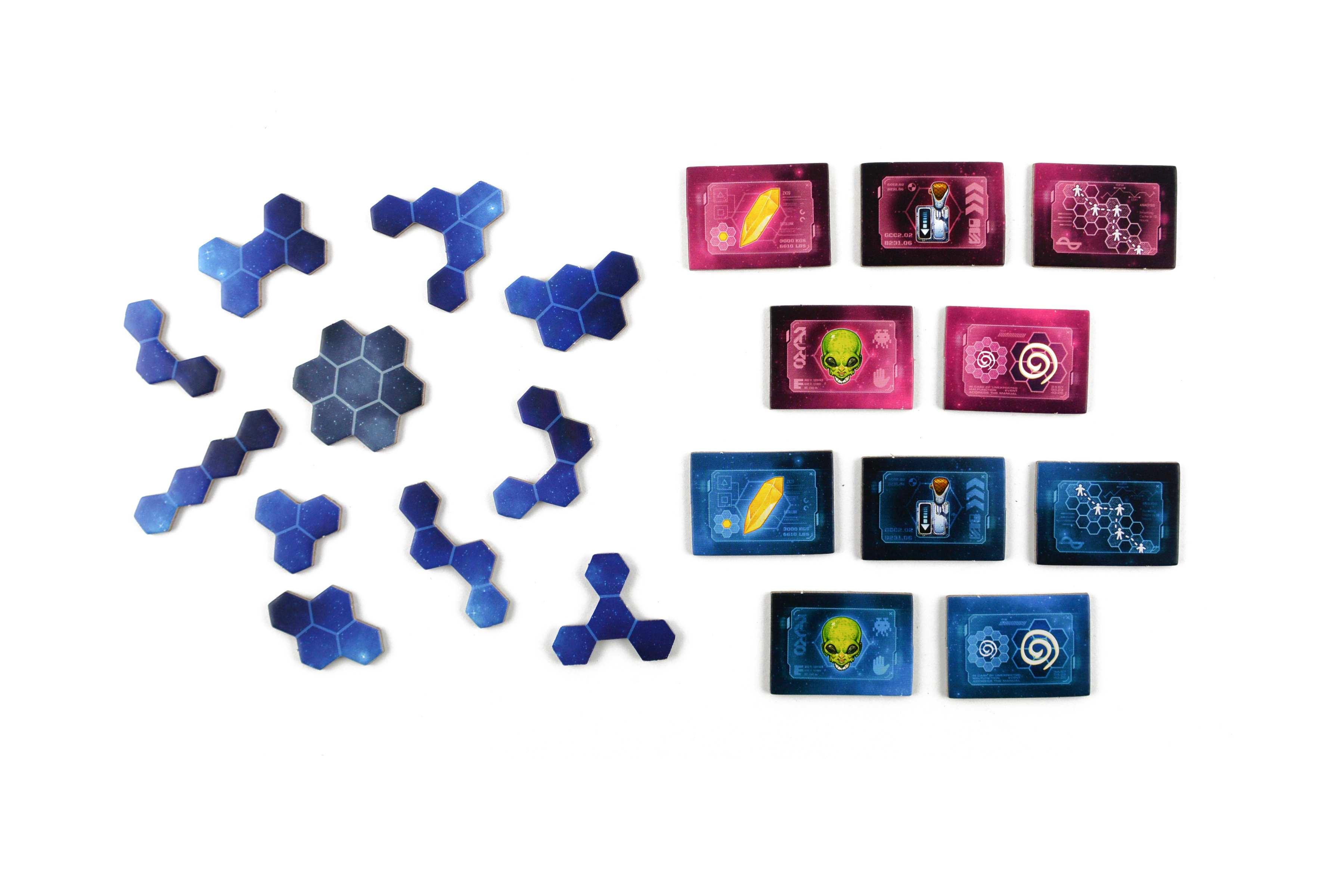 - 10 żetonów misji (2 identyczne zestawy po 5 żetonów)