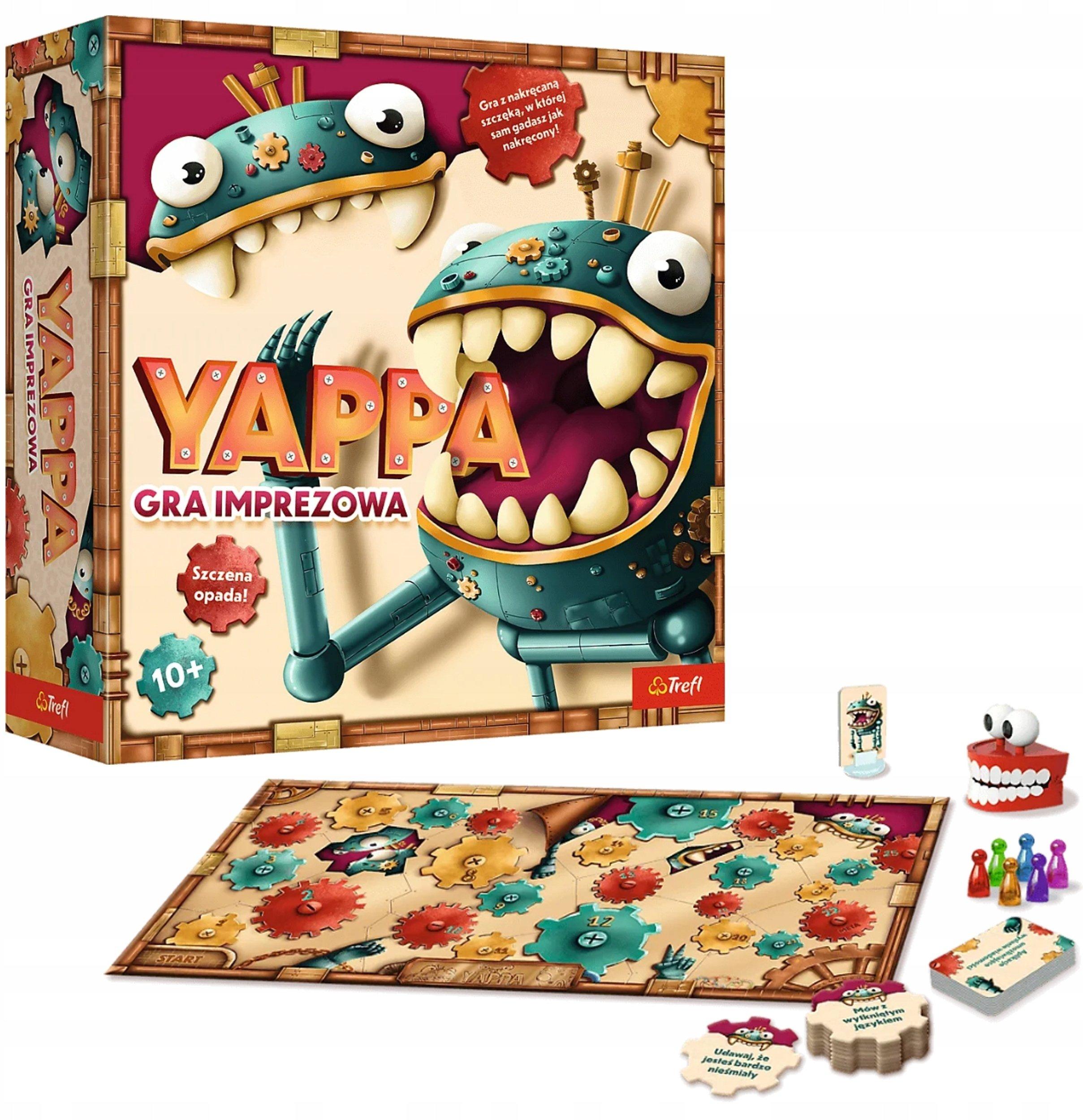 Czas na odpowiedź odmierzany jest przez wyjątkowy "zegar" nakręcaną szczękę, która buduje napięcie z każdą sekundą. Nakręć szczękę do oporu, weź kartę i zacznij błyskawicznie udzielać odpowiedzi, zanim czas się skończy! Każde poprawne hasło to cenne punkty, które przybliżają Cię do zwycięstwa. Wydaje się proste? Tylko do momentu, gdy do gry wkroczą różnego rodzaju przeszkadzajki, zabawne utrudnienia, które sprawiają, że nawet najłatwiejsze pytanie potrafi nagle stanowić wyzwanie. Musisz wykazać się kreatywnością, umiejętnością improwizacji i odpornością na presję... a przede wszystkim dobrym humorem. "Yappa" gwarantuje salwy śmiechu, emocje do ostatniej sekundy i niezapomniane rozgrywki w gronie rodziny i przyjaciół.