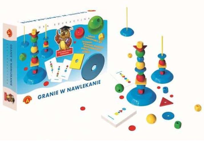 Nawlekając elementy na słupek osadzony w podstawce, dzieci uczą się rozróżniać kształty i kolory. Gra jest też dobrym treningiem zręczności i uczy dążenia do realizacji określonego planu. Zawartość: Karty wzorów 32 sztuki Słupki 3 sztuki Podstawki 3 sztuki Kule 12 sztuk Kostki 12 sztuk Koła 3 sztuki Trójkąty 3 sztuki Kwadraty 3 sztuki Żetony 30 sztuk Instrukcja Wiek graczy: 4+ Liczba graczy: 1-3