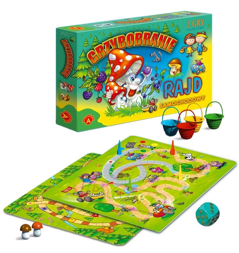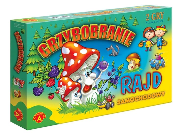 "Grzybobranie" to gra, w której gracze wybierają się do lasu na jagody i grzyby. Kto uzbiera ich więcej do swego koszyka i będzie pierwszy na drugim końcu toru, zostaje zwycięzcą. Po drodze trzeba jednak uważać na wilka, na to, by nie zabłądzić w lesie lub nie wrzucić do kosza muchomora. Gra jest prosta i bardzo atrakcyjna dzięki wielu rekwizytom. W "Rajdzie samochodowym" gracze ścigają się na torze gry. W trakcie wyścigu trzeba bardzo uważać, by nie spowodować kraksy lub nie "złapać gumy". Wygrywa ten, kto pokona przeciwności i pierwszy dotrze na metę. Zawartość pudełka: dwustronna plansza, 4 pionki, 4 koszyki, 7 owoców, 20 grzybów, kostka do gry, instrukcja. Wiek: 4+ 2-4 graczy