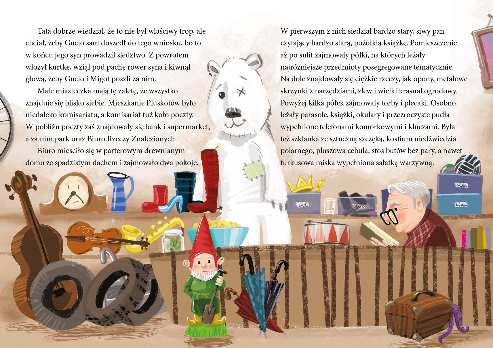 Gucio Pluskot ma siedem i pół roku. Jest zapalonym detektywem i nie rozstaje się z lupą i notesem, ponieważ nigdy nie wiadomo, kiedy nadarzy się okazja do przeprowadzenia nowego śledztwa. W rozwiązywaniu zagadek pomaga mu kot Migot.