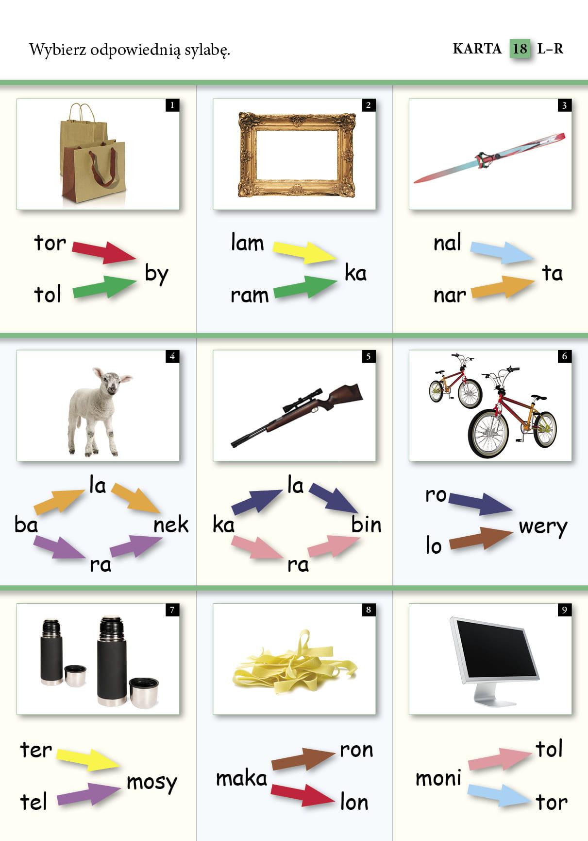 Każda z 32 kart pracy składa się z 9 pól, na których przedstawiono fotografie znanych dziecku przedmiotów, postaci, zwierząt czy roślin.
