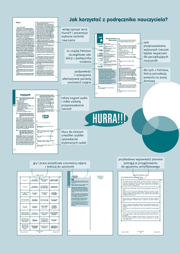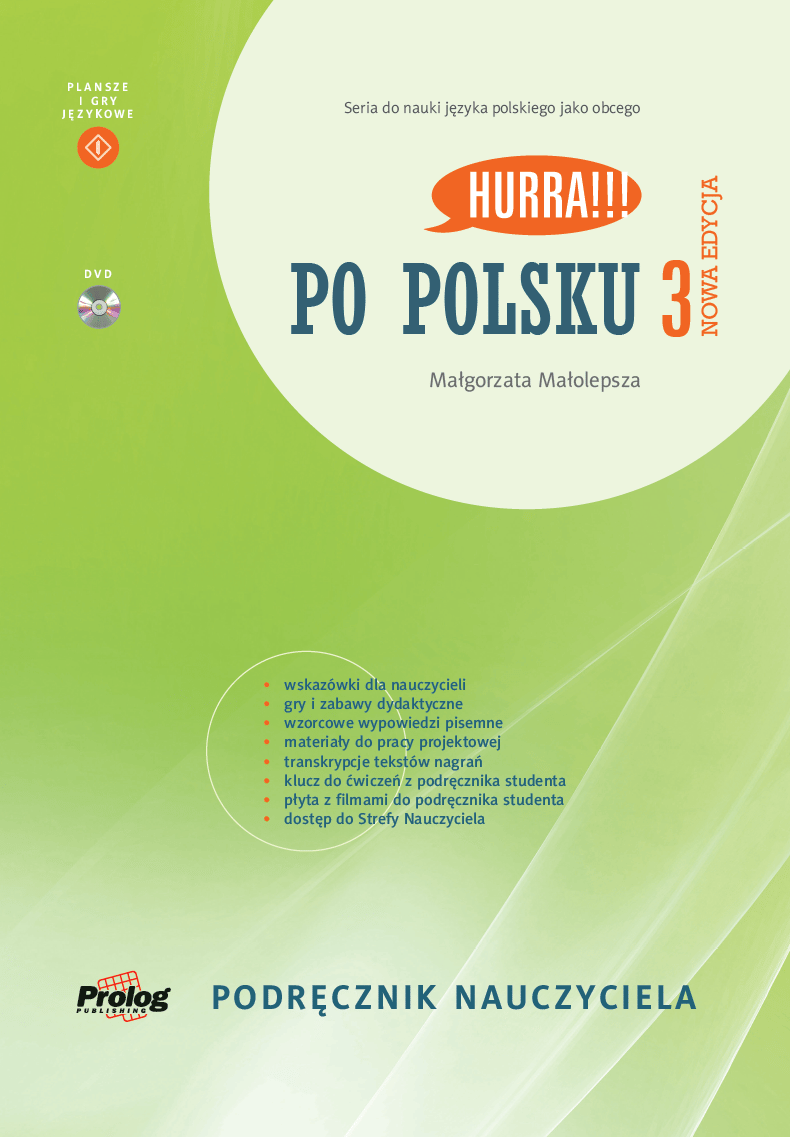 HURRA!!! PO POLSKU 3 Podręcznik nauczyciela. Nowa Edycja  zawiera: uwagi metodyczne do podręcznika studenta ułatwiające pracę na lekcjach i alternatywne rozwiązania dydaktyczne, dodatkowe gry i zabawy dydaktyczne wspomagające rozwijanie poszczególnych sprawności językowych, a także opanowanie słownictwa i zasad gramatycznych, materiały do kopiowania, wzorcowe wypowiedzi pisemne wymagane na egzaminie certyfikatowym B1, materiały do pracy projektowej, transkrypcje nagrań z podręcznika studenta, klucz z rozwiązaniami ćwiczeń zawartych w podręczniku studenta, gry do pobrania online w wersji dodruku, płytę DVD Video z filmami do podręcznika studenta, w wersji z napisami i bez napisów, dostęp do Strefy Nauczyciela z materiałami dodatkowymi.