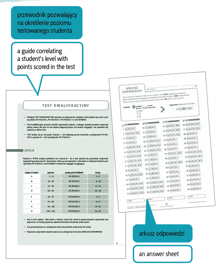TEST KWALIFIKACYJNY pozwala określić odpowiedni poziom, z którego uczący się języka polskiego jako obcego powinien rozpocząć dalszą naukę z podręczników „PO POLSKU 1”, „PO POLSKU 2” i „PO POLSKU 3” z serii HURRA!!! Test składa się ze 120 pytań sprawdzających kompetencje gramatyczne i leksykalne. Jest to test wyboru. Test zawiera także: – arkusz odpowiedzi, – szablon odpowiedzi, – zestawienie, które pomaga uplasować uczącego się na podstawie uzyskanej liczby punktów.