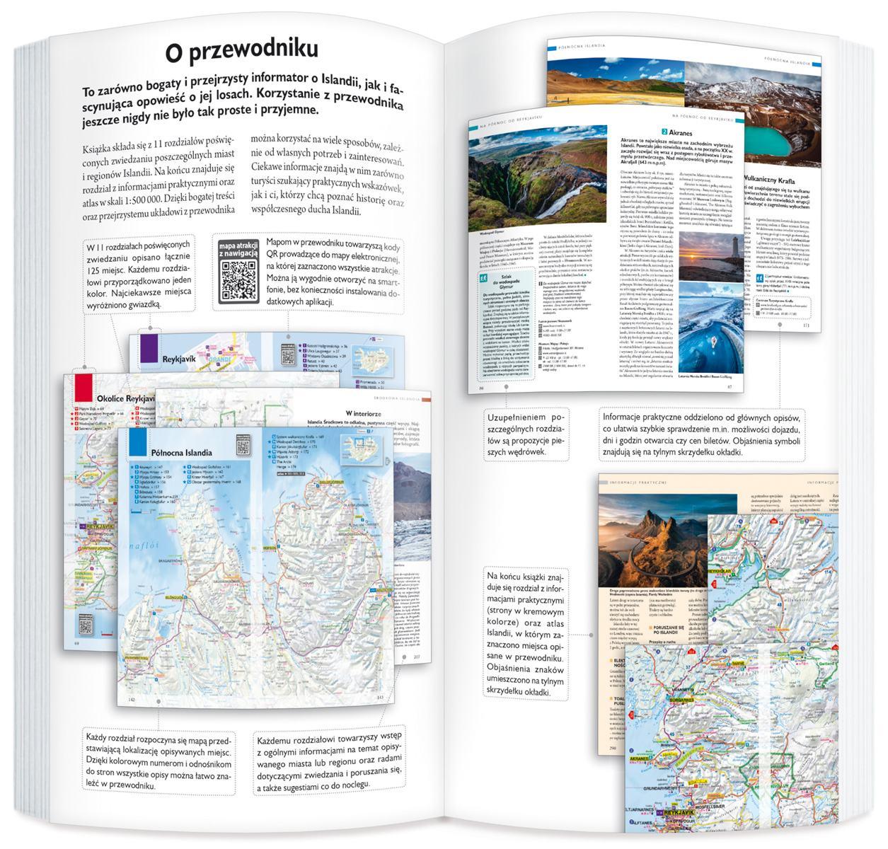 Bogaty i przejrzysty przewodnik po Islandii z kodem QR, który prowadzi do dodatkowych map.