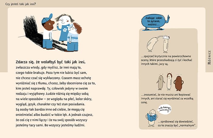 Dzieci często zadają pytania mające naturę pytań filozoficznych. Dlaczego ludzie umierają? Dlaczego muszę słuchać rodziców? Dlaczego na świecie są wojny? Wobec takich pytań dorośli niejednokrotnie czują się bezradni. Nie wiedzą, w jaki sposób rozmawiać z dziećmi na trudne tematy, jakich udzielić odpowiedzi. Bo też czy istnieją jednoznaczne odpowiedzi? Seria DZIECI FILOZOFUJĄ skonstruowana jest w formie rozmowy dzieci i dorosłych. Wykorzystując naturalną prostotę dziecięcych pytań i odpowiedzi, otwiera drzwi do odwiecznych filozoficznych problemów, takich jak znaczenie życia, etyka, emocje, tożsamość czy świadomość. Każdy tom zawiera sześć ważnych pytań. Każde pytanie prowadzi do sześciu możliwych odpowiedzi, których mogłoby udzielić dziecko. Z kolei każda odpowiedź prowadzi do kilku nowych pytań, które w jakiś sposób podważają wcześniejszą odpowiedź. A wszystko to w odniesieniu do codziennego życia dziecka. Charakterystyczne ilustracje oparte na koncepcji żartu rysunkowego pomagają spojrzeć na omawiany problem w sposób humorystyczny, delikatny, poetycki czy nawet nieco wywrotowy - wszak myślenie to świetna zabawa! Książki Oscara Brenifiera wspierają naturalną skłonność dzieci do zadawania pytań o siebie, życie i świat, kształtując u nich tym samym analityczny i abstrakcyjny sposób myślenia. Tytuły rozdziałów w tomie JA, CO TO TAKIEGO?: - Czy jesteś zwierzęciem? - Czy cieszysz się, że rośniesz? - Czy jesteś taki jak inni? - Czy jesteś coś winien swoim rodzicom? - Czy lubisz przeglądać się w lustrze? - Czy sam decydujesz o tym, kim jesteś? Polecamy również: UCZUCIA, CO TO TAKIEGO? ŻYCIE, CO TO TAKIEGO? DOBRO I ZŁO, CO TO TAKIEGO? W przygotowaniu: PIĘKNO I SZTUKA, CO TO TAKIEGO? Marta Lipczyńska-Gil o książce: Oscar Brenifier nie daje prostych odpowiedzi, w zasadzie mnoży pytania, prowokując do własnych poszukiwań, i to jest ogromna siła tej serii. To nie są książki dla leniwych rodziców i dzieci, o nie! Pytania, które stawia autor, często są niewygodne, ale jeśli zadamy je sobie i naszym dzieciom jednocześnie, okaże się, że wspólne poszukiwanie odpowiedzi jest fascynujące, zbliża nas do siebie, daje poczucie, że w odwiecznym szukaniu sensu istnienia nie jesteśmy sami. „Pytam, więc jestem” – mógłby równie dobrze powiedzieć Kartezjusz, a zatem pytajmy ile wlezie!