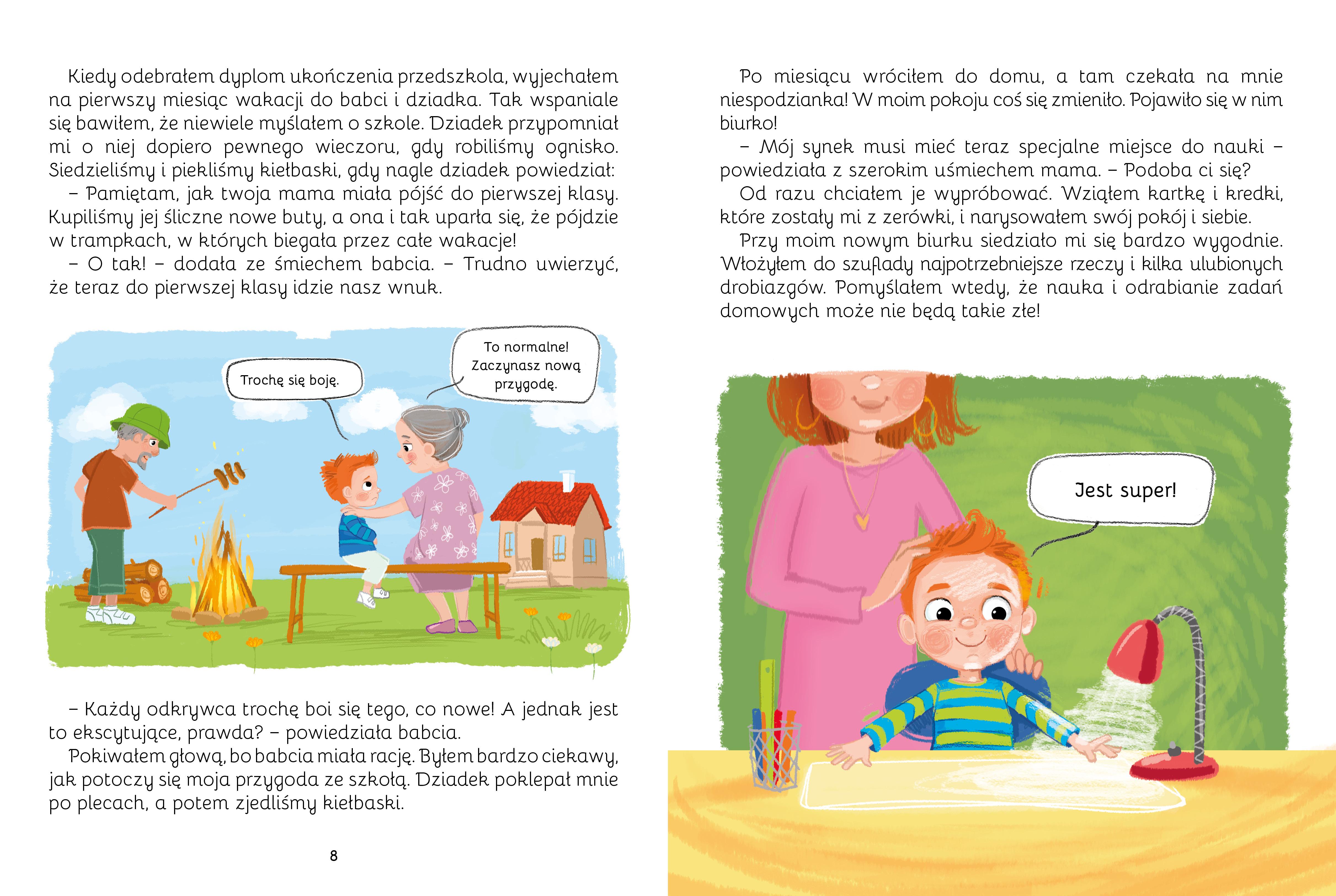 Ta książka w przystępny i niezwykle trafny sposób dotyka tematu niepewności i obaw związanych z rozpoczęciem nauki szkolnej. Opisuje typowe dziecięce wątpliwości i podsuwa wiele praktycznych porad. Wszystko po to, by pomóc przyszłemu uczniowi oswoić się z dużą zmianą, która czeka go po ukończeniu przedszkola. Dorosłym zaś daje impuls do wspierania dziecka w tym ważnym momencie życia, aby został pozytywnie zapamiętany.