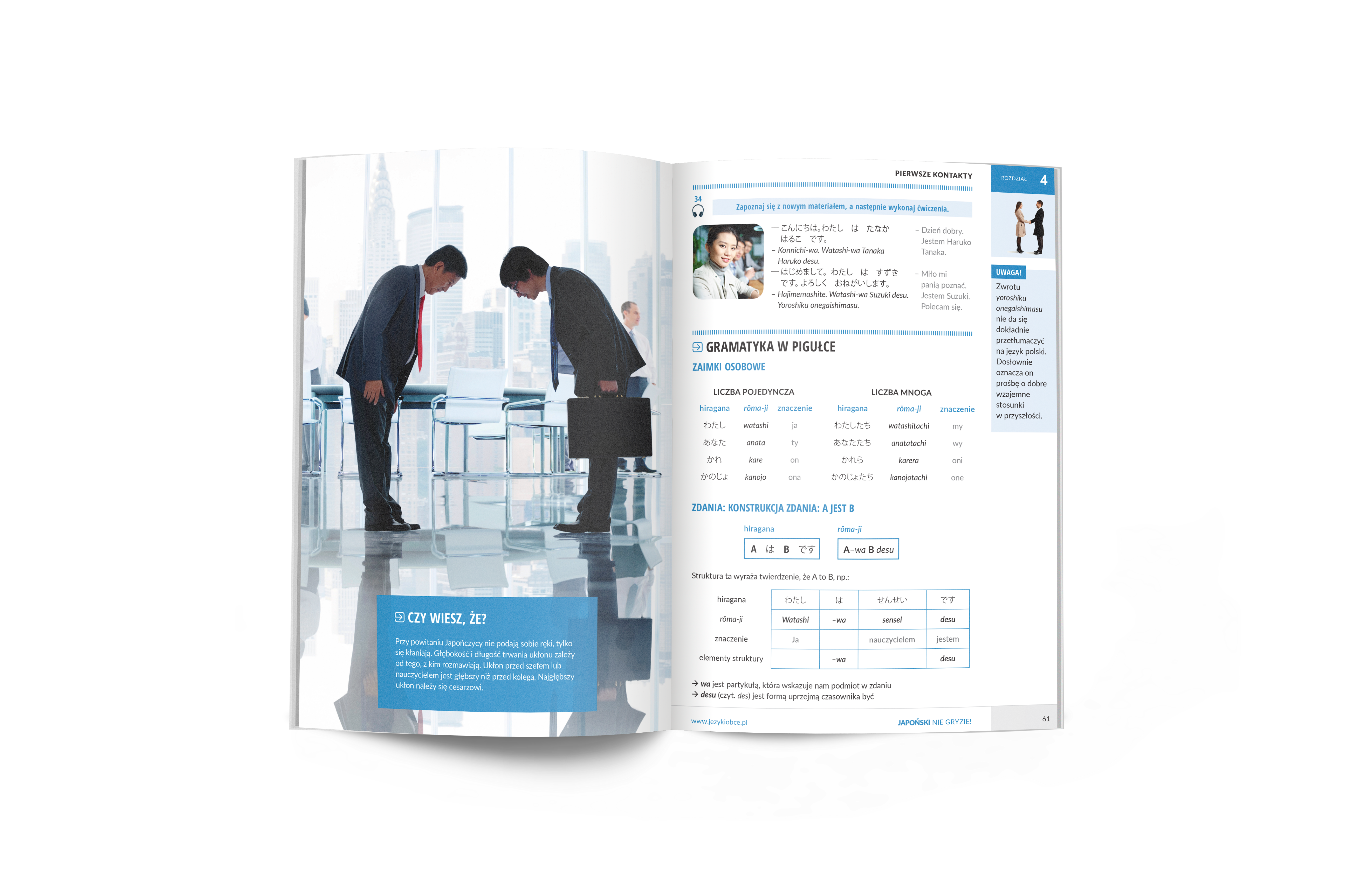 Książka opiera się na niezwykle atrakcyjnej metodzie aktywnej nauki języka poprzez rozwiązywanie różnorodnych ćwiczeń. W rozdziałach tematycznych znajdziesz: najpopularniejsze zagadnienia, materiały dla początkujących do nauki pisma– hiragany i katakany, krótkie dialogi lub teksty z polskim tłumaczeniem, gramatykę w pigułce, porcję niezbędnego słownictwa, ciekawostki o kulturze oraz specjalną sekcję Sprawdź się z zadaniami podsumowującymi. W każdej chwili masz dostęp do umieszczonych na marginesach praktycznych minisłowniczków, a dodatkowo na końcu książki znajdziesz podręczny zbiorczy słownik.