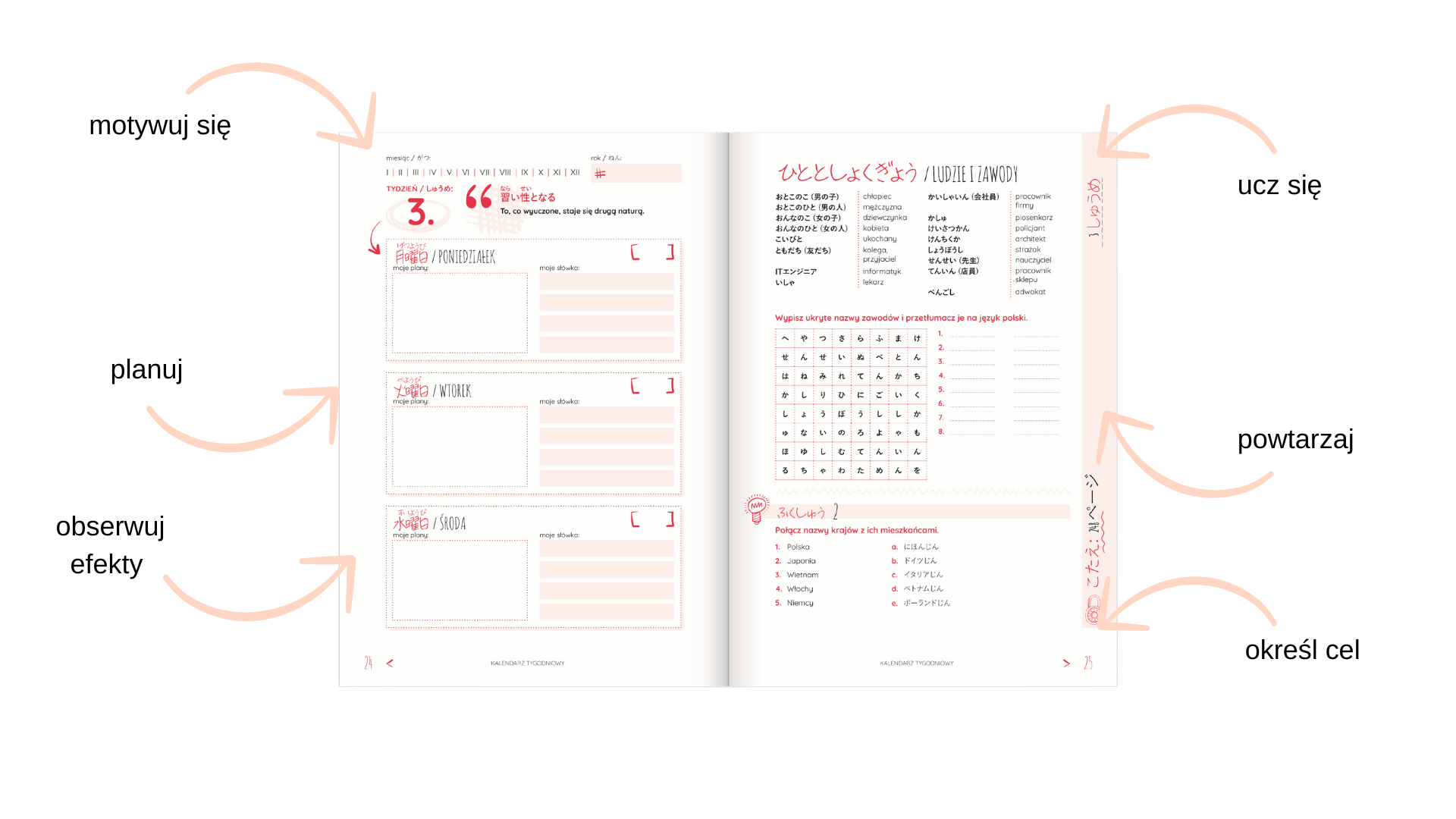 Chcesz zacząć naukę japońskiego i poznać japońskie pismo, ale systematyczność nie jest twoją mocną stroną? Skorzystaj z narzędzia, które podtrzyma twoją motywację, jak długo zechcesz! Oto Japoński Planer językowy, z którym nauka wejdzie ci w nawyk, a jej efekty zobaczysz już w ciągu kilku tygodni.
