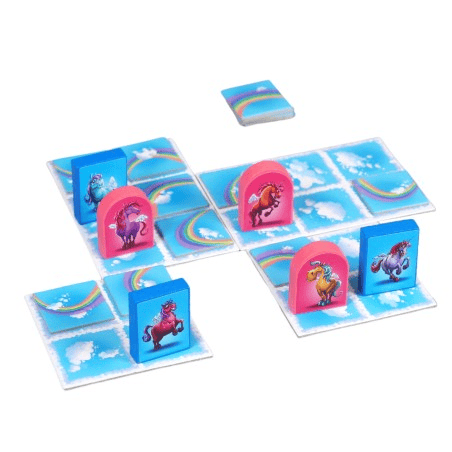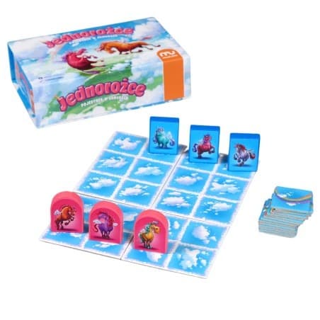 Jednorożce. Pojedynek w chmurach to dwuosobowa gra taktyczna, w której jednorożce skaczą po chmurkach i zostawiają za sobą tęczę. Co ważne, poruszają się w charakterystyczny sposób ruchem skoczka, czyli jednej z figur szachowych. Jeśli jeden z graczy nie będzie mógł wykonać ruchu, drugi gracz wygrywa.