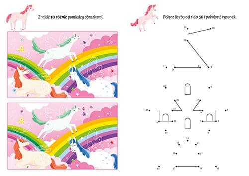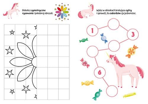 Dzięki ODPOWIEDNIO DOBRANYM i ZRÓŻNICOWANYM ZADANIOM dzieci mogą ćwiczyć wiele kompetencji, świetnie się przy tym bawiąc wśród bohaterów krainy jednorożców.
