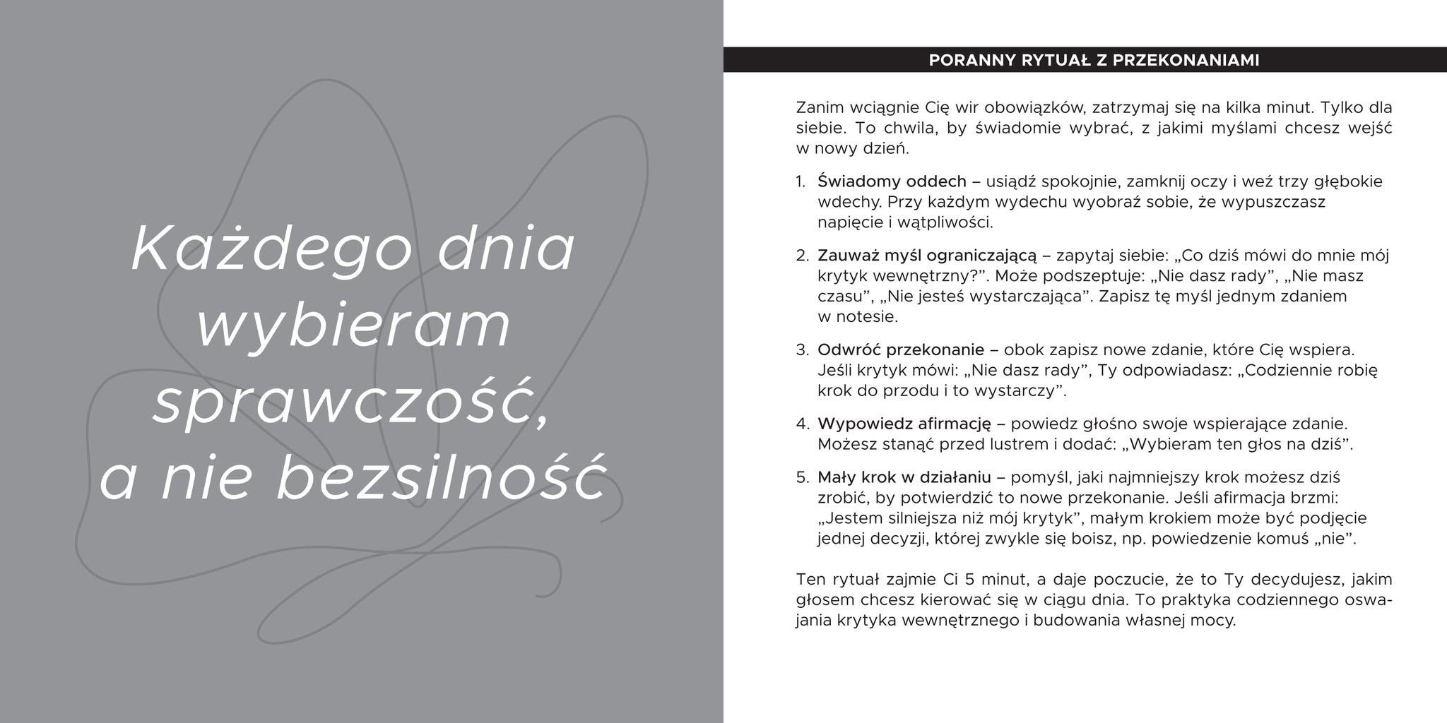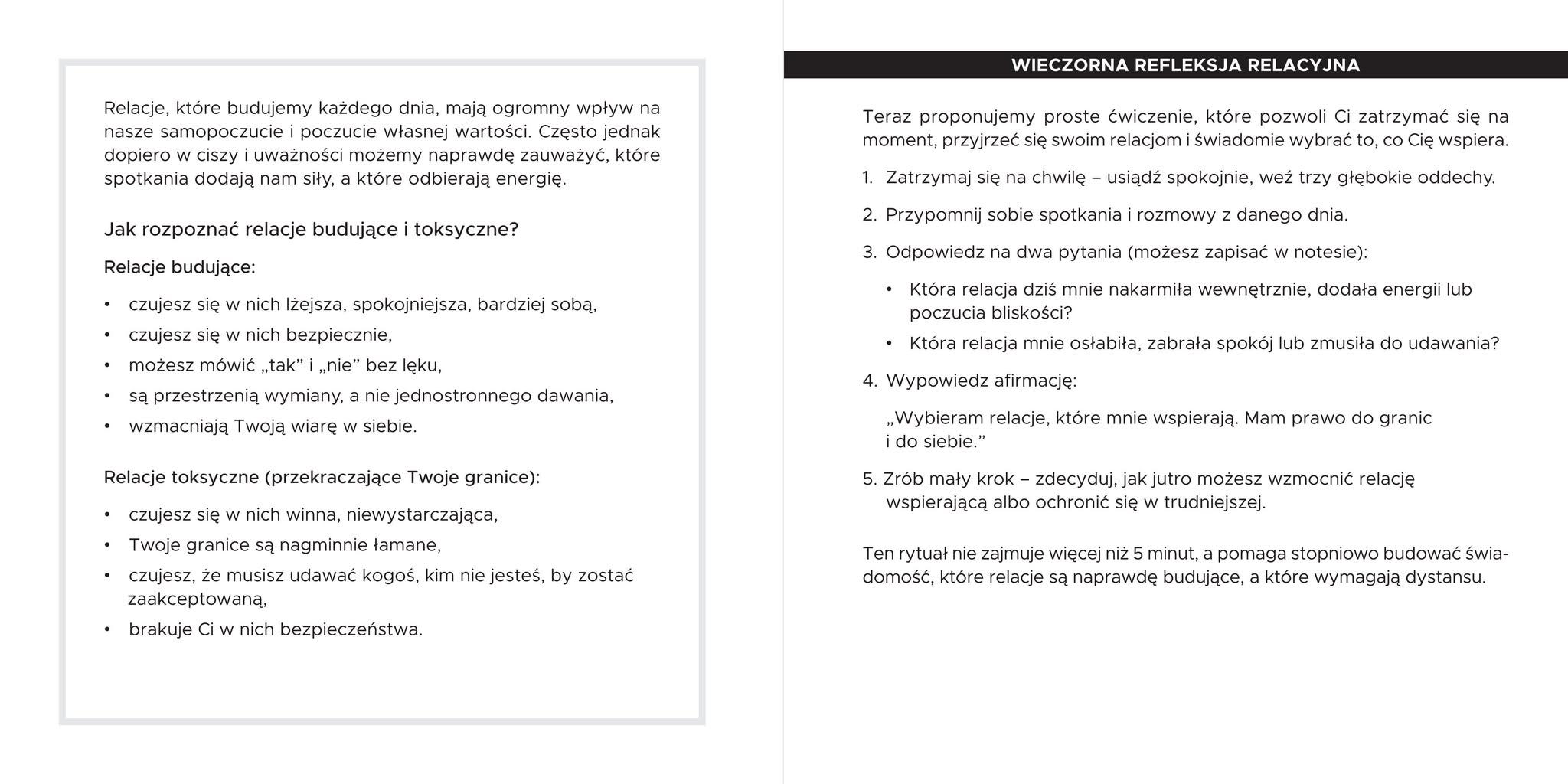„Przewodnik do wnętrza siebie” to coś więcej niż książka, napisana z myślą o Tobie — kobiecie, która pragnie spokoju, równowagi i głębszego kontaktu ze sobą. Nie znajdziesz tu gotowych recept ani rad, jak żyć. Znajdziesz za to pytania, które naprawdę mają znaczenie. Afirmacje, które dodają sił. Narzędzia psychologiczne i coachingowe, które pomogą Ci spojrzeć na siebie z nowej perspektywy. To przestrzeń, w której możesz się zatrzymać, zaopiekować sobą, wsłuchać w swoje emocje, potrzeby i marzenia. Przestrzeń, w której Jesteś Ważna. Zatrzymaj się. Oddychaj. Odkryj siebie na nowo!