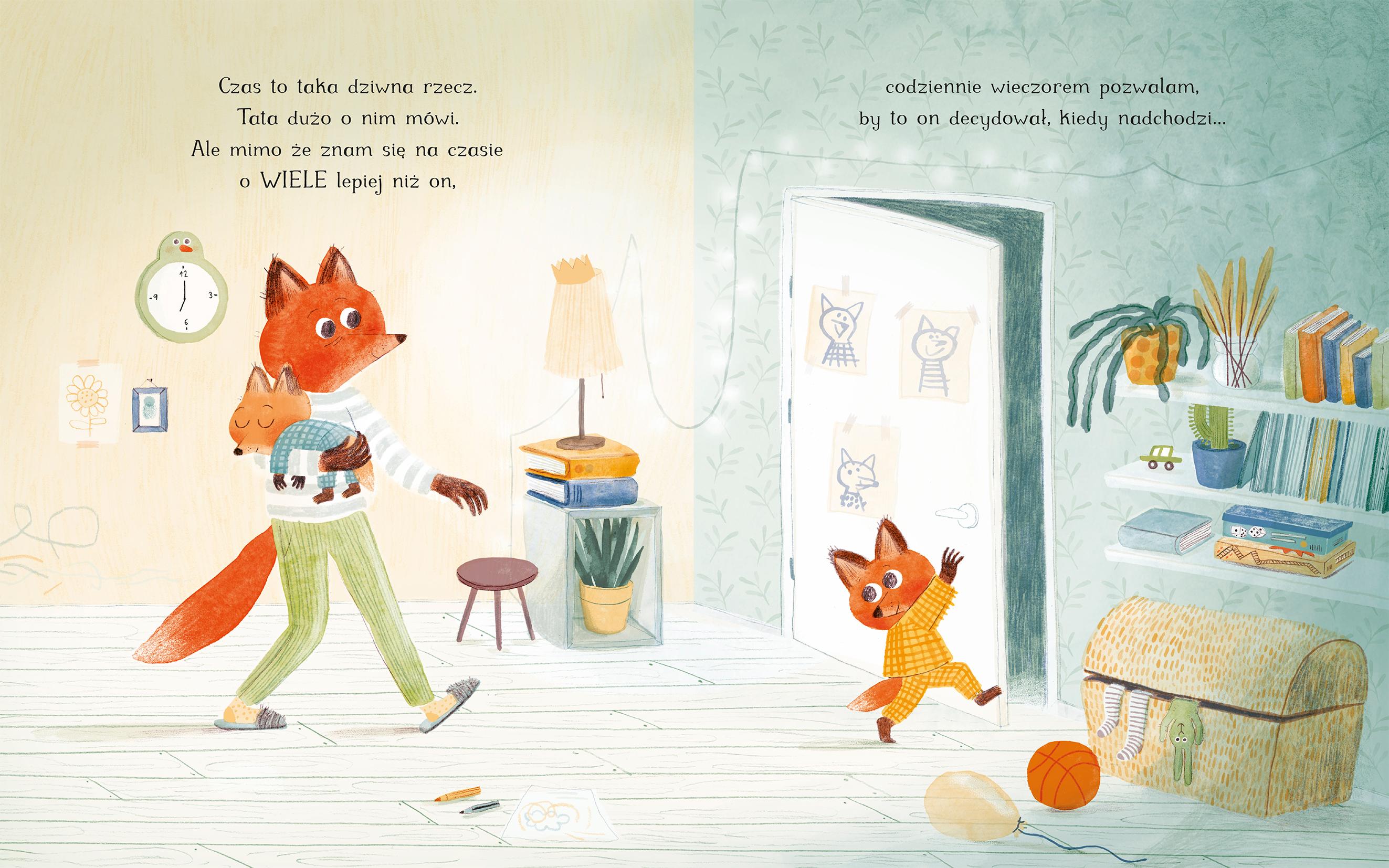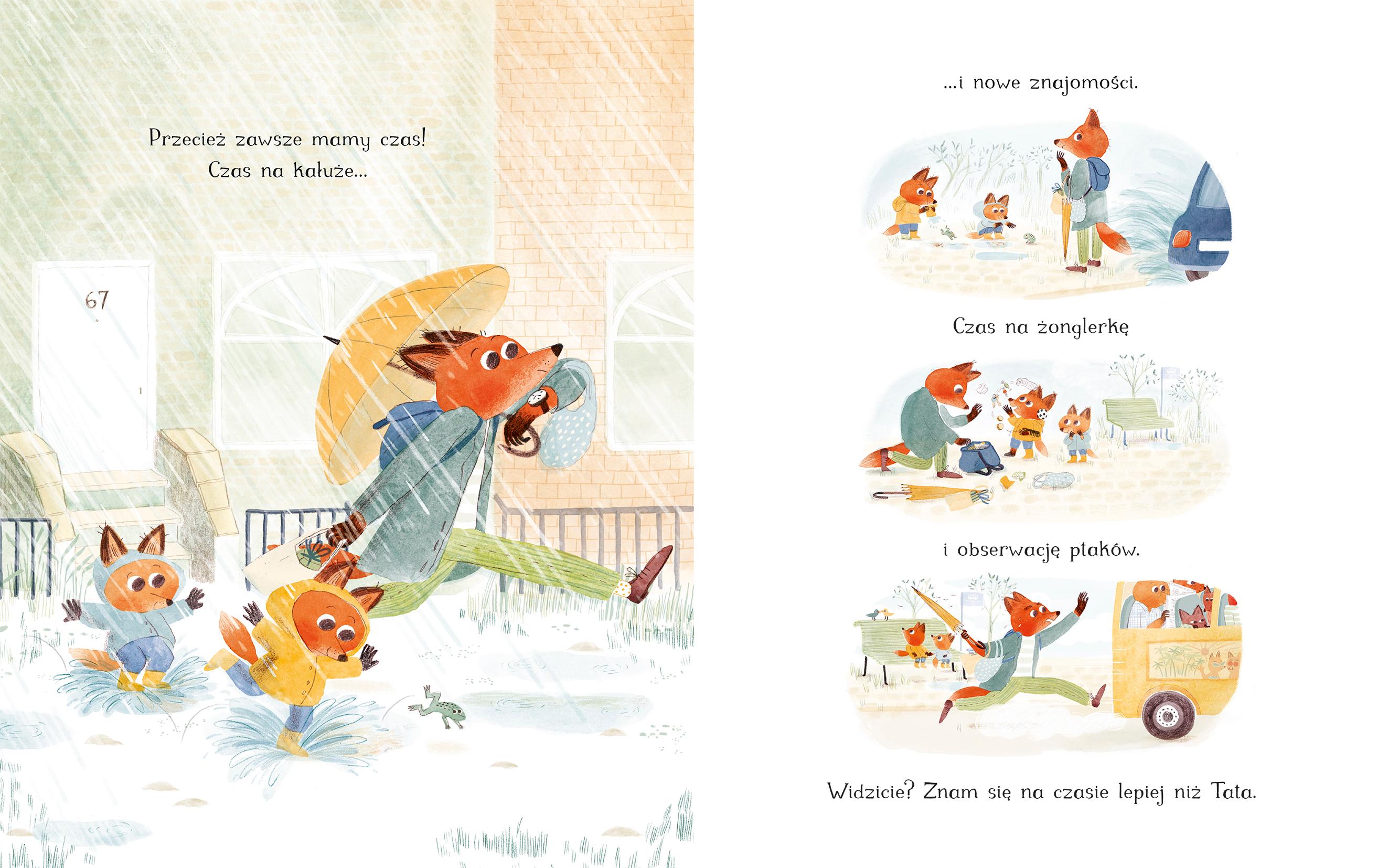 Czas to taka dziwna rzecz. Tata dużo o nim mówi. Ale wydaje mi się, że znam się na czasie lepiej niż on. Dlatego codziennie rano to ja mówię Tacie, kiedy... ...czas wstawać! Okazuje się, że według dziecka najlepszą porą na wstawanie jest piąta rano. Zaspany tata prosi wtedy o jeszcze pięć minut, bo myśli, że to niewiele. Ale to nieprawda! Dzieci najlepiej potrafią dowieść, że pięć minut to znacznie więcej czasu niż mogłoby się wydawać. Od rana aż do wieczora obserwujemy dzień z życia pewnej rodziny: taty lisa i jego dwójki lisich urwisów. Tata w pośpiechu załatwia mnóstwo spraw i wciąż goni za własnym ogonem, aż dosłownie pada z nóg. A jego dzieci podążają w ślad za nim, robiąc dokładnie to, czego chcą, bez względu na pośpiech lub ograniczenia czasowe. Na szczęście maluchy chętnie dzielą się z tatą tajemnicą czasu, bo biedak nie ma o tym zielonego pojęcia. Pięć minut to mnóstwo czasu! Przekonacie się o tym, czytając nową książkę Marty Altés Jeszcze pięć minut, uroczą, pełną delikatnego humoru historię o tym, jak ważny jest czas spędzany razem. Opowieść w równym stopniu zachwyci dzieci, jak i ich zabieganych rodziców.
