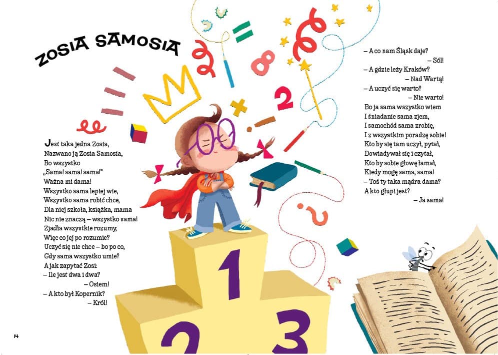 „Julian Tuwim. Wiersze dla dzieci” to wyjątkowy zbiór ponadczasowych utworów jednego z najważniejszych polskich poetów XX wieku. Julian Tuwim, znany z niezwykłej wrażliwości i poczucia humoru, zaprasza młodych czytelników do świata pełnego dźwięków, rytmu i zabawy słowem. W tej książce znajdziesz 29 najbardziej popularnych, rozpoznawalnych i lubianych wierszy znanego poety. Książka została opracowana z myślą o najmłodszych: teksty są czytelne, a ilustracje pogodne i kolorowe, dzięki czemu wspólne czytanie staje się przyjemnością zarówno dla dzieci, jak i dorosłych. Wiersze Tuwima uczą spostrzegawczości, pobudzają wyobraźnię oraz wprowadzają w świat wartości — pokazują siłę marzeń, przyjaźni i odwagi.