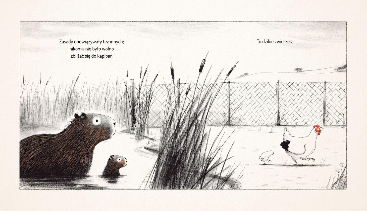 W gospodarstwie pełnym kurczaków i kur każdy dzień jest taki sam, jest dużo jedzenia, każdy zna swoje miejsce i nic nadzwyczajnego się nie zdarza. To znaczy, dopóki nie przybędą kapibary. Jest ich wiele, są duże, są mokre, są inne, są tutaj. Nie! Zdecydowanie NIE ma dla nich miejsca. Nagrody: → Białe Kruki, 2020 → Biblioteka Publiczna Nowego Jorku, najlepsze książki w języku hiszpańskim 2020 – Zwycięzca → Babelia Selection – El País, 2020 → Nagroda Fundacji Cuatrogatos, 2021 → Recenzja z gwiazdką Kirkusa, 2021 → Nagroda Książkowa dla Środowiska – Miglior Coerenza Grafica – Testo, 2022