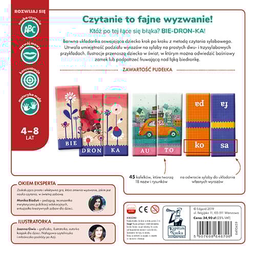 Układanka sylabowa wspierająca naukę czytania Układanka sylabowa „Czytam i układam sylaby” to atrakcyjna graficznie propozycja wspierająca rozwój mowy oraz umiejętności czytania u przedszkolaków i dzieci w wieku wczesnoszkolnym. Dzięki układance dzieci rozwijają umiejętność budowania prostych słów z sylab oraz dopasowywania do siebie części tego samego obrazka. Układanka wspiera rozwój kreatywności w tworzeniu własnych wyrazów oraz kształtuje poprawny kierunek czytania (od lewej do prawej strony). Wspomaga również rozwój zdolności motorycznych. Układanka „Czytam i układam sylaby” polega na łączeniu sylab w wyrazy, które są nazwami znanych dziecku zwierząt oraz obiektów. W skład pakietu wchodzi 45 dwustronnych kafelków, z których można ułożyć 9 dwusylabowych i 9 trzysylabowych nazw. Na odwrocie znajdują się sylaby, z których można układać własne wyrazy. Barwne ilustracje Joanny Gwis przenoszą dziecko w świat, w którym można odwiedzić baśniowy zamek lub podpatrzeć fruwającą nad łąką biedronkę. Elementy układanki zostały wykonane z grubej tektury, co gwarantuje bezpieczną zabawę oraz wytrzymałość nawet podczas najbardziej emocjonujących rozgrywek. Rozwój: nauka czytania, rozwój mowy, koncentracja, motoryka mała Ilustratorka: Joanna Gwis – graficzka, ilustratorka, autorka książek dla dzieci. Nałogowa czytelniczka i miłośniczka podróży po Azji. Kocia mama dla Antka, Koksika, Koko, Paprocha i Dzidzi. W serii również Czytam i układam słowa