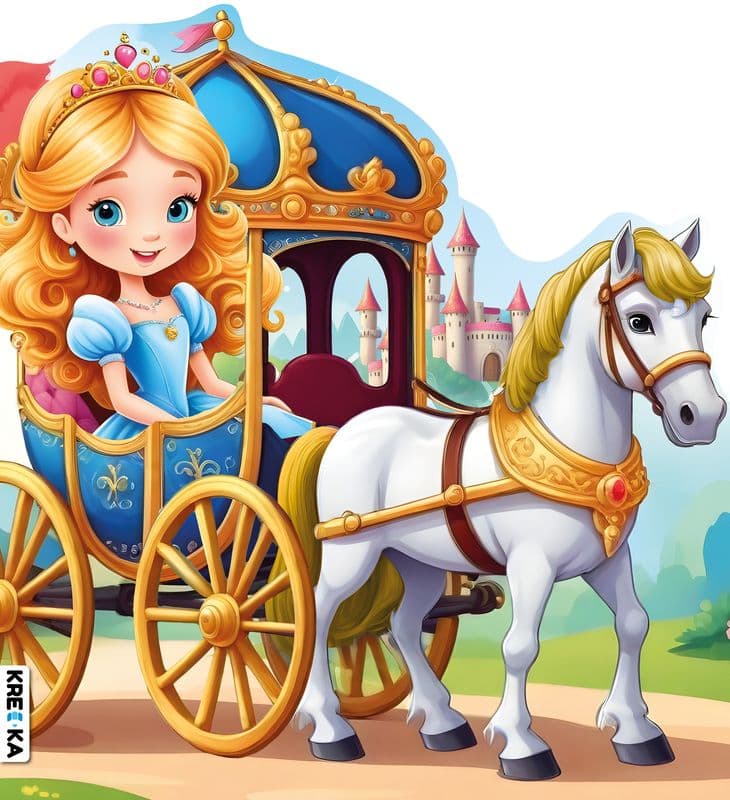 Kolorowanka z naklejkami skrojona na kształt karety z księżniczką. Rewelacyjna zabawa i uczta dla oczu malucha.