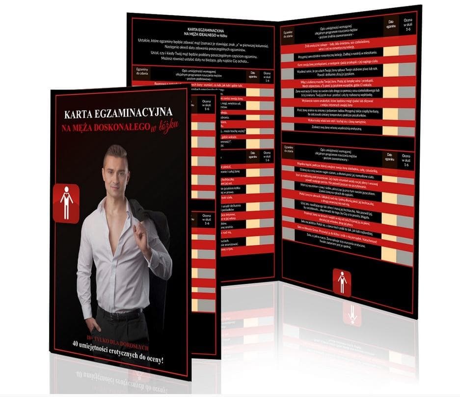 Karta egzaminacyjna męża idealnego w łóżku to zabawa erotyczna w której żona, może przeegzaminować swojego świeżo poślubionego męża. Maż staje przed swoim egzaminatorem wyposażonym w listę umiejętności wymaganych przez oficjalny program edukacji erotycznej dla mężów. To żona - nauczycielka decyduje, w jakiej kolejności będą wykonywane zadania egzaminacyjne i wystawia mężowi odpowiednią ocenę. Jeżeli ocena będzie niska, partner może próbować starać się o poprawienie swojego wyniki - do czego zachęcamy.