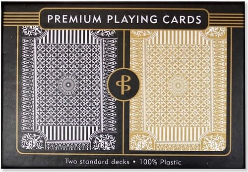 Karty do gry Czarne/Złote marki Peter Pauper Press. Symbole figur i kolorów mają duże i czytelne oznaczenia. Idealne dla miłośników gier Poker i Black Jack. Karty są bardzo trwałe i wytrzymałe na zagięcia (wykonane w 100% z plastiku). W atrakcyjnym opakowaniu znajdują się dwie talie, każda z nich zawiera 52 kart oraz 2 jokery. Awers ozdobia klasyczny wzór europejski.