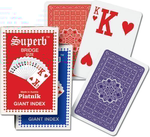 Najwyższej jakości karty z wielkimi indeksami wyprodukowane przez Piatnika specjalnie dla osób bardzo słabo widzących. Talia składa się z 55 plastikowanych kart o wymiarach 58 x 89 mm i gramaturze 310. Wyroby wiedeńskiej fabryki Ferd. Piatnik & Sohne od 1824 roku urzekają bogactwem wzorów i perfekcją wykonania. Jakość i tradycja!