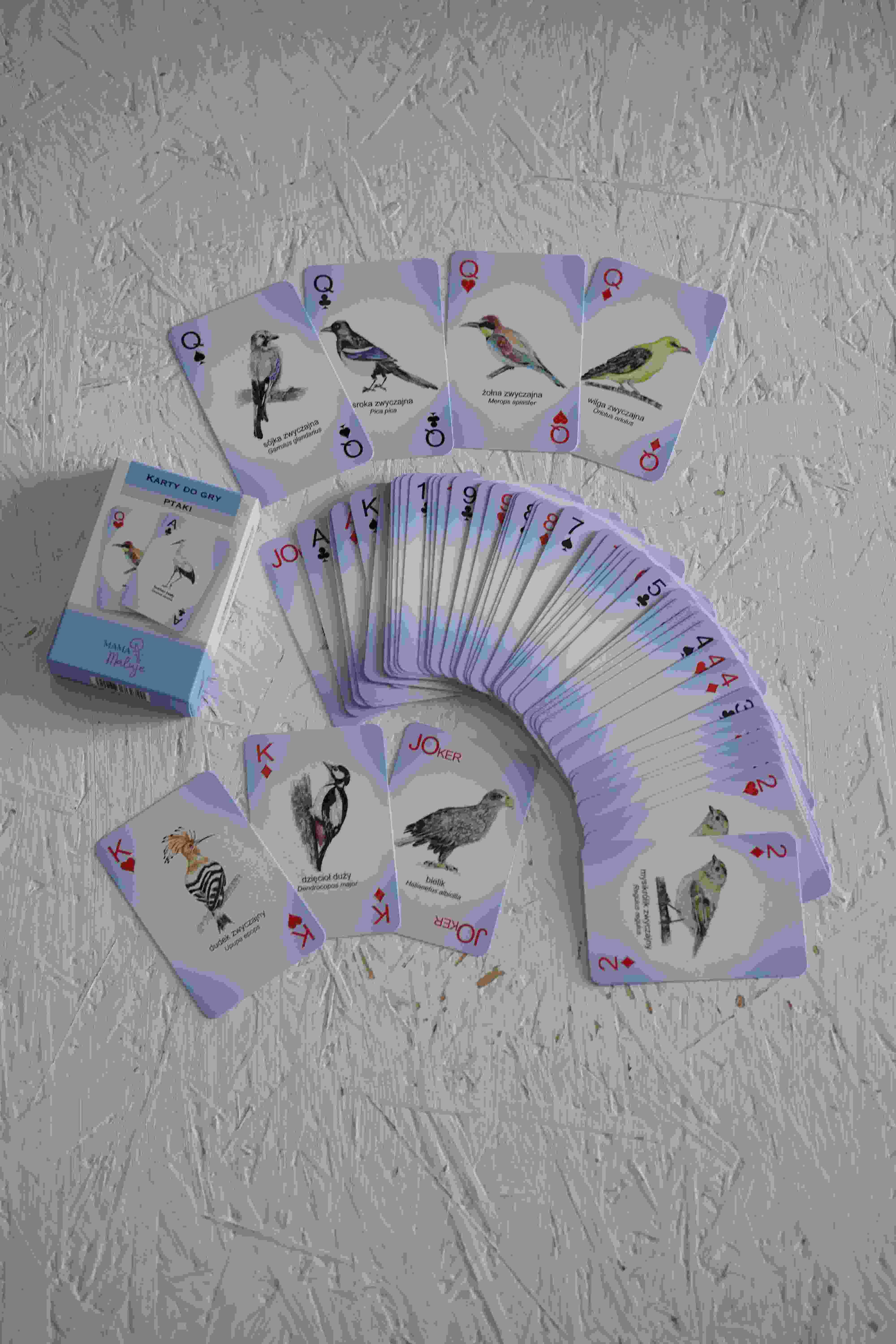 Zestaw zawiera 55 kart do gry z podobiznami ptaków, wykonanych na podstawie ręcznie malowanych ilustracji akwarelowych.