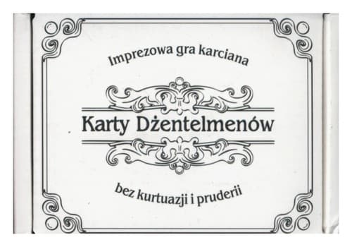 Karty Dżentelmenów to imprezowa gra towarzyska bez kurtuazji i pruderii, za to z ogromną dawką czarnego humoru. Dżentelmeńskie rozgrywki z pewnością urozmaicą każde spotkanie w gronie błyskotliwych i obdarzonych niebywałym poczuciem humoru osób. Nie powinno jej zabraknąć na Twojej imprezie. Produkt posiada przejrzyste zasady, co zachęci każdego do gry i pozwoli szybko wczuć się w atmosferę pełną czarnego humoru. Grą kieruje prosta mechanika: w każdej kolejce – Dżentelmen – zadaje pytanie z Czarnej Karty, a pozostali odpowiadają za pomocą swojej najzabawniejszej Białej Karty. Drugim sposobem wykorzystania gry Karty Dżentelmenów jest tworzenie z jej pomocą opowieści pełnych czarnego humoru bez cenzury. Podczas gry w Dżentelmeńskie Opowieści wszyscy gracze wspólnie tworzą absurdalne i wciągające historie w oparciu o frazy z Białych Kart. Pozwólcie się zaskoczyć efektami Waszej kreatywności! Gra Karty Dżentelmenów dzięki eleganckiej oprawie nadaje się na wyszukany i na pewno trafiony prezent. Jako jedyna na polskim rynku gra karciana zawiera anglojęzyczne odpowiedniki pytań i odpowiedzi, dzięki którym pokonuje bariery międzykulturowe i umożliwia zabawę na międzynarodowym poziomie. Kieszonkowe pudełko wersji podstawowej zawiera 220 plastikowanych kart na profesjonalnym papierze karcianym z wkładką węglową, a w tym: 53 Czarne Karty pytań 159 Białe Karty odpowiedzi 4 puste Białe Karty na Twoją odpowiedź 4 karty instrukcji Wiek graczy: 18+ Liczba graczy: 3-15 Czas rozgrywki: 30 minut
