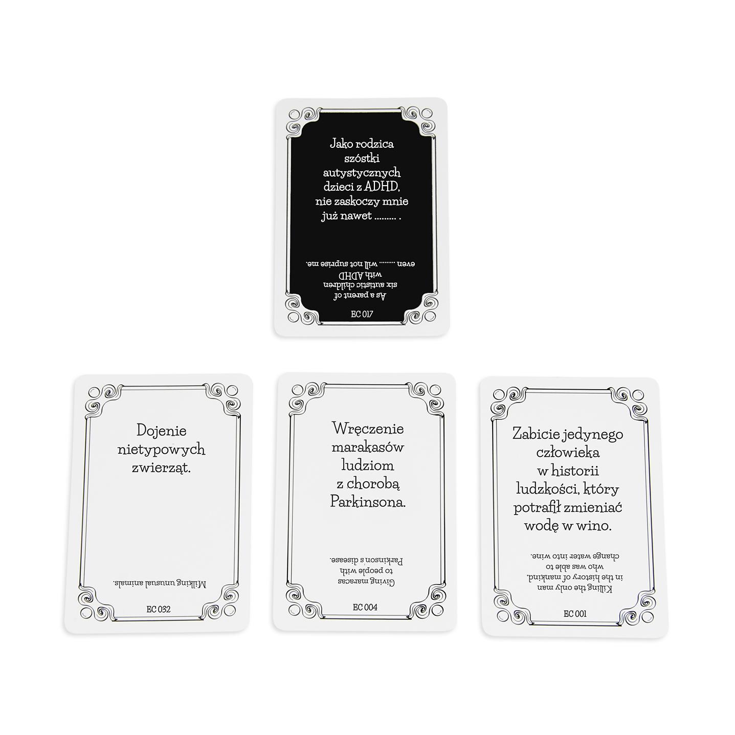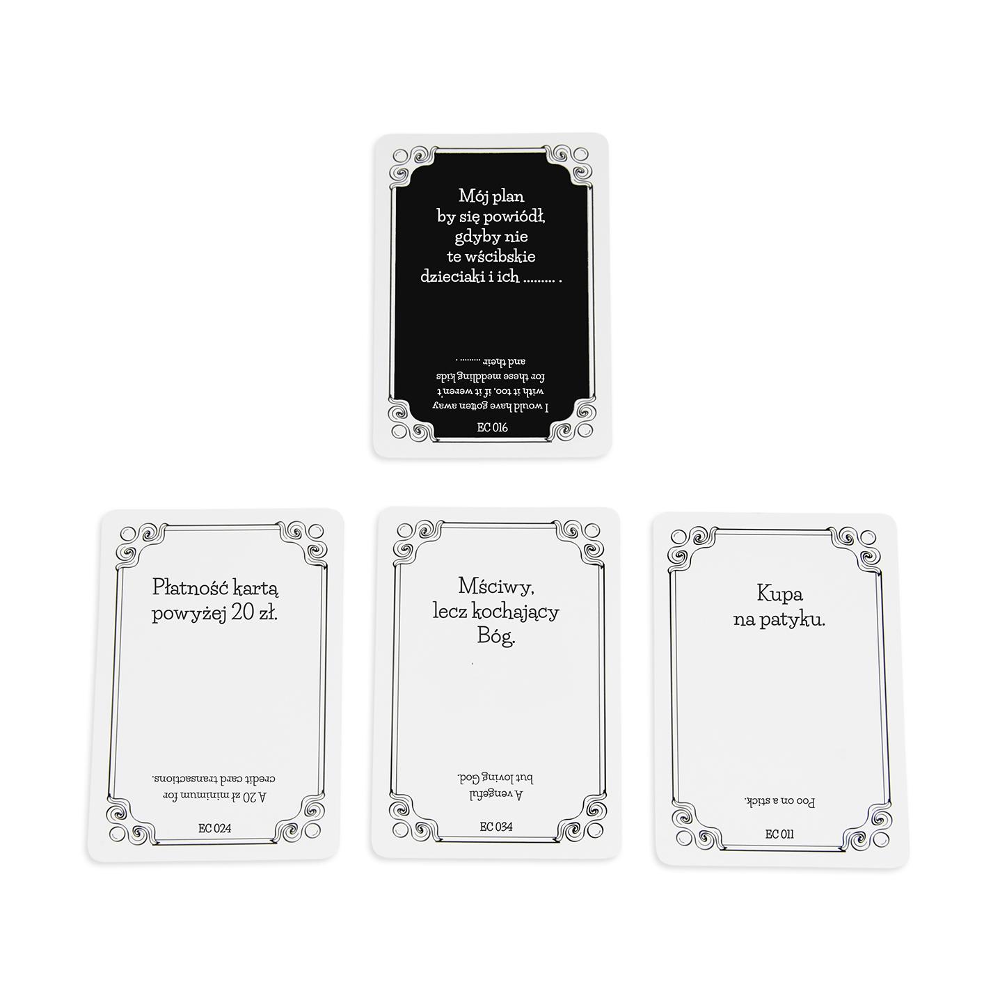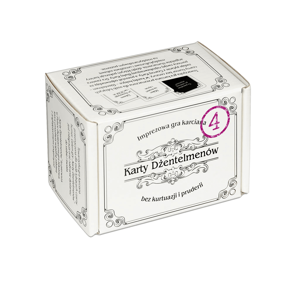 Czwarta edycja gry imprezowej dla miłośników czarnego humoru Pocałuj prababcię w czoło i wyłącz aparaturę podtrzymującą życie! :) Karty Dżentelmenów: Epizod Czwarty to towarzyska gra karciana przeznaczona dla osób lubiących czarny humor bez cenzury! W każdej kolejce Dżentelmen zadaje pytanie z Czarnej Karty, a pozostali odpowiadają za pomocą swojej najzabawniejszej Białej Karty. To pierwsza w Polsce dwujęzyczna gra tekstowa tego typu, która umożliwia wspólną zabawę z anglojęzycznymi znajomymi! Karty Dżentelmenów: Epizod Czwarty to imprezowa gra dla 3 do 15 dorosłych graczy, którzy muszą wyzbyć się kurtuazji i pruderii. Sprawdź na ile grzeczni są Twoi znajomi! Pudełko zawiera 220 kart w tym: 50 nowych Czarnych Kart pytań 155 nowych Białych Kart odpowiedzi 15 pustych (5 Czarnych i 10 Białych) kart na Twoje pomysły Pełna kompatybilność z pozostałymi częściami