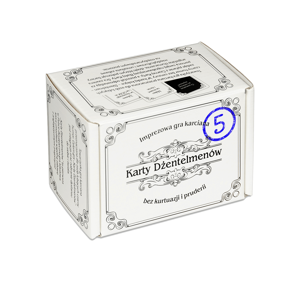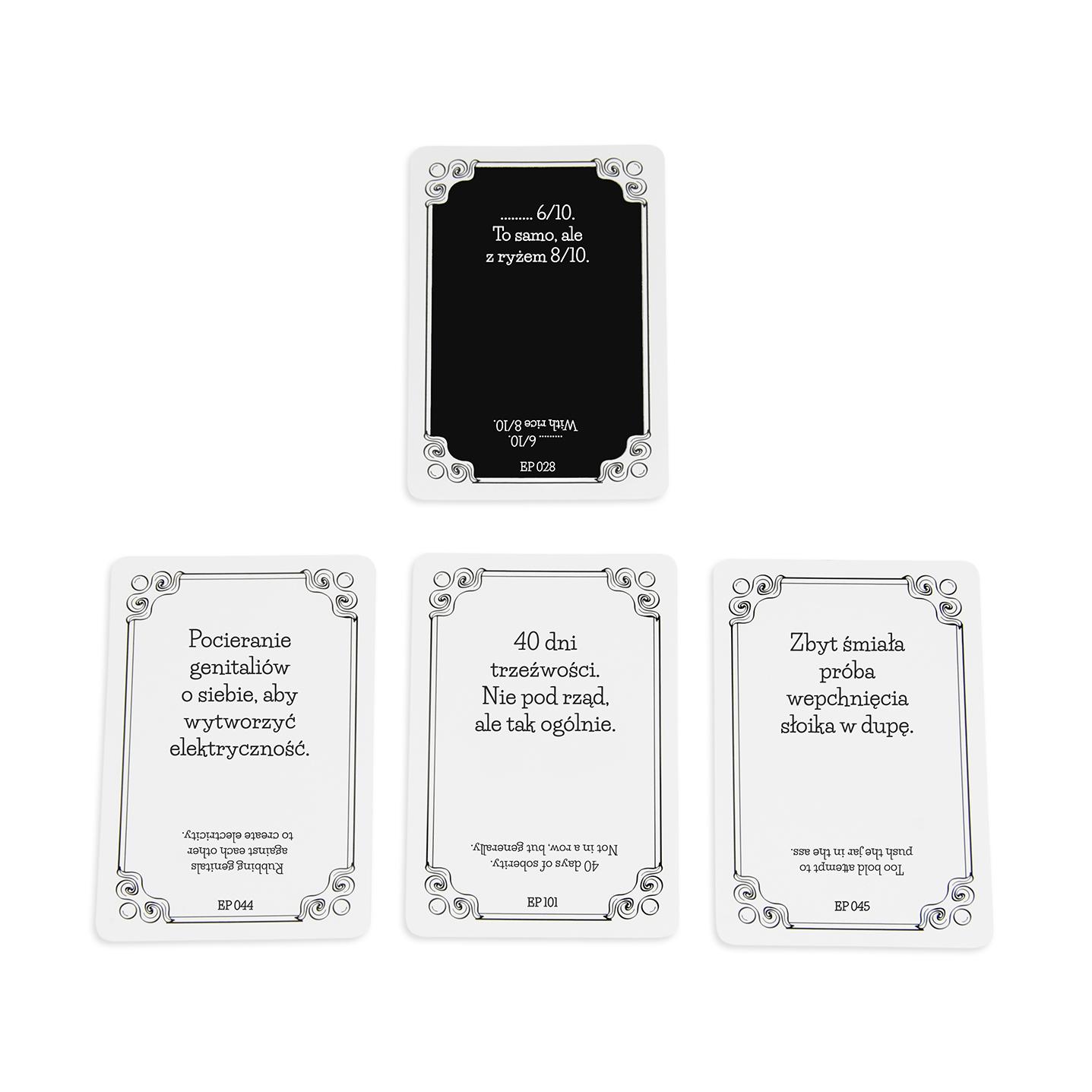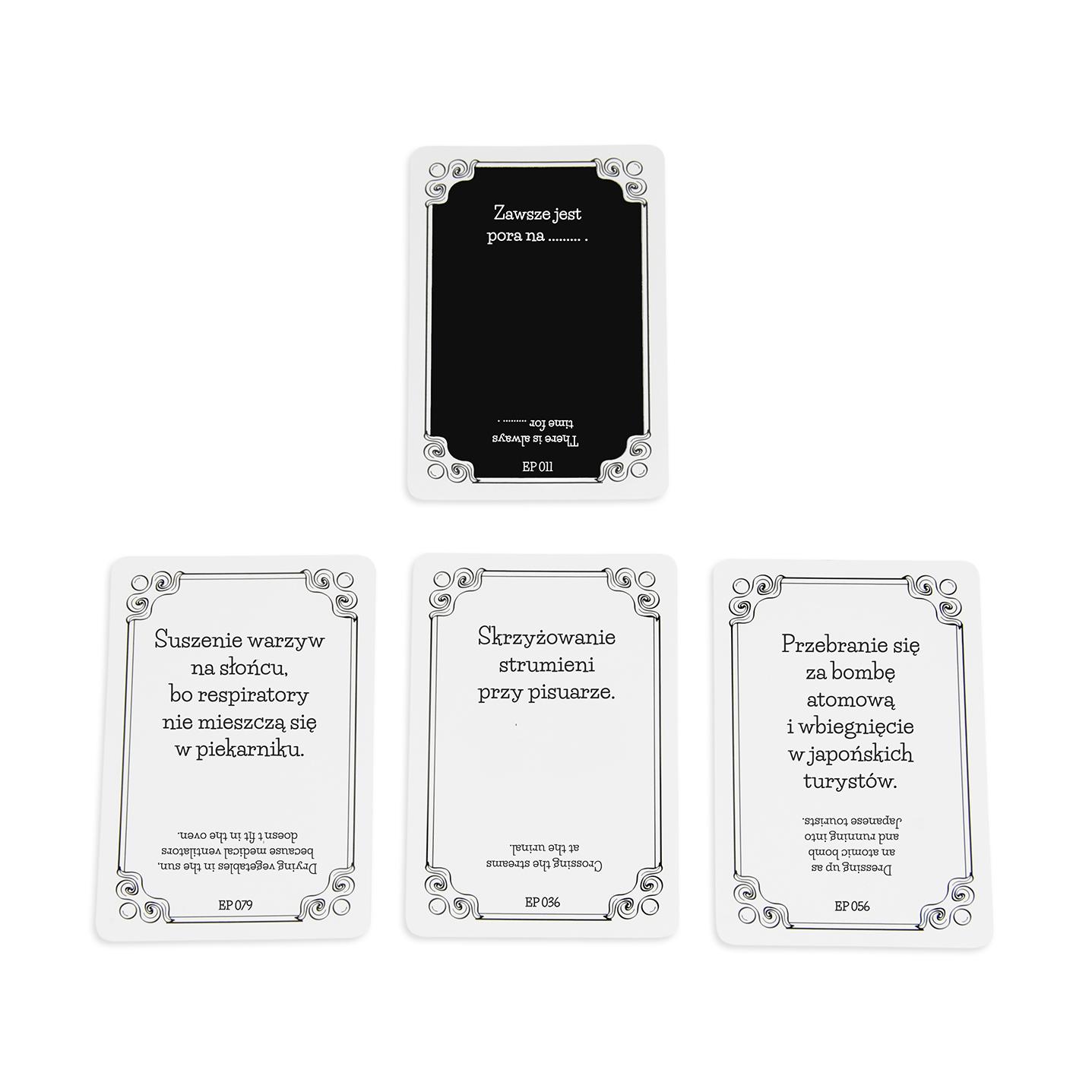 To pierwsza w Polsce dwujęzyczna gra tekstowa, która umożliwia wspólną zabawę z anglojęzycznymi znajomymi. W każdej kolejce - Dżentelmen - zadaje pytanie z Czarnej Karty, a pozostali odpowiadają za pomocą swojej najzabawniejszej Białej Karty. Gra zawiera niecenzuralne teksty Wiek: 18+ Ilość graczy - 3-15 Sugerowany czas: 30+ Pudełko zawiera 220 kart w tym: 50 Nowych Czarnych Kart pytań 160 Nowych Białych Kart odpowiedzi 10 pustych kart na Twoje pomysły instrukcję