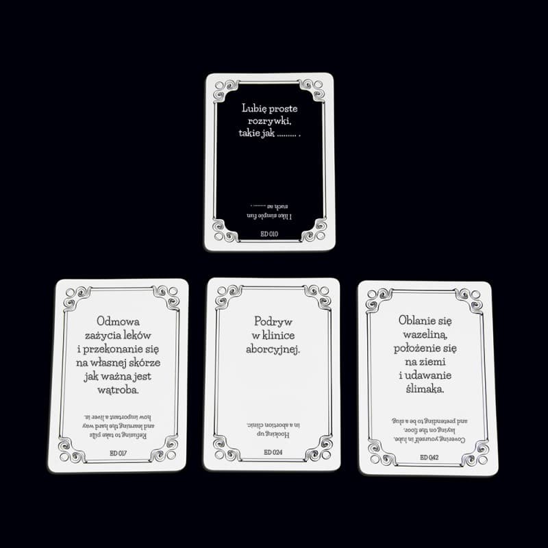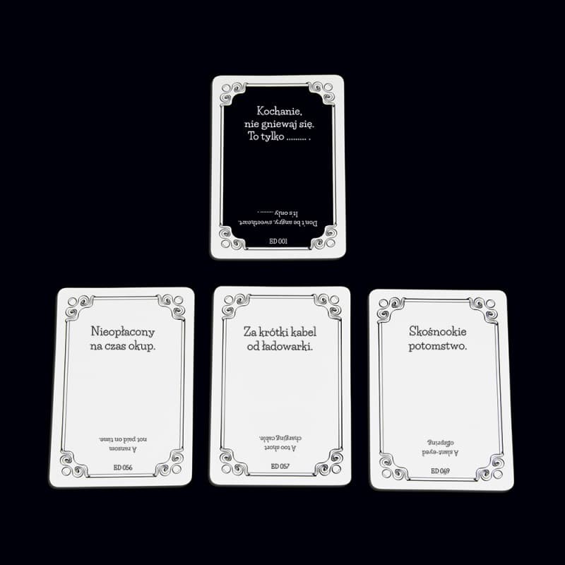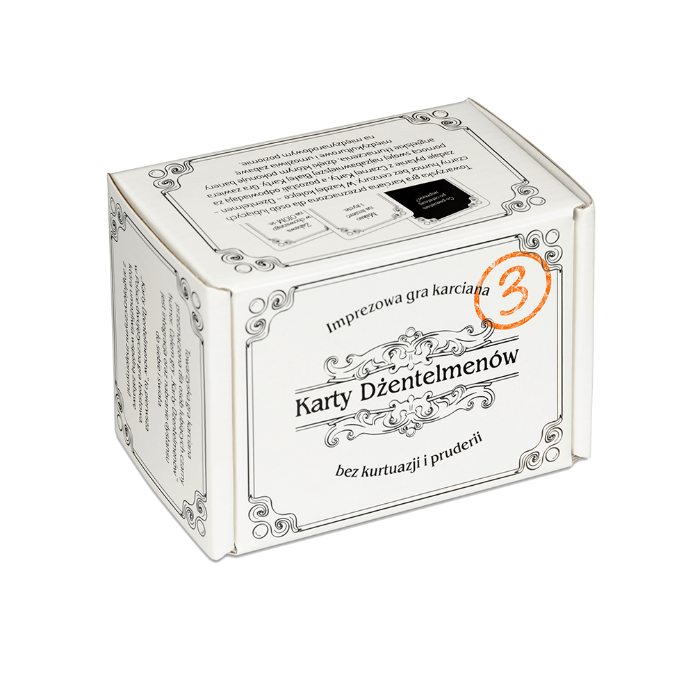 Karty Dżentelmenów to imprezowa gra towarzyska bez kurtuazji i pruderii, za to z ogromną dawką czarnego humoru. Dżentelmeńskie rozgrywki z pewnością urozmaicą każde spotkanie w gronie błyskotliwych i obdarzonych niebywałym poczuciem humoru osób. Nie powinno jej zabraknąć na Twojej imprezie! Epizod Trzeci zawiera 220 kart, a w tym: 148 kart z 4 rozszerzeń: Ekstra Pytania Ekstra Odpowiedzi Wyleciało nam to z głowy... Dżentelmeńskie Opowieści 72 zupełnie nowe karty (17 Czarnych i 55 Białych)! Pełna kompatybilność z pozostałymi częściami Wiek graczy: 18+ Liczba graczy 3-15 Czas rozgrywki 30+