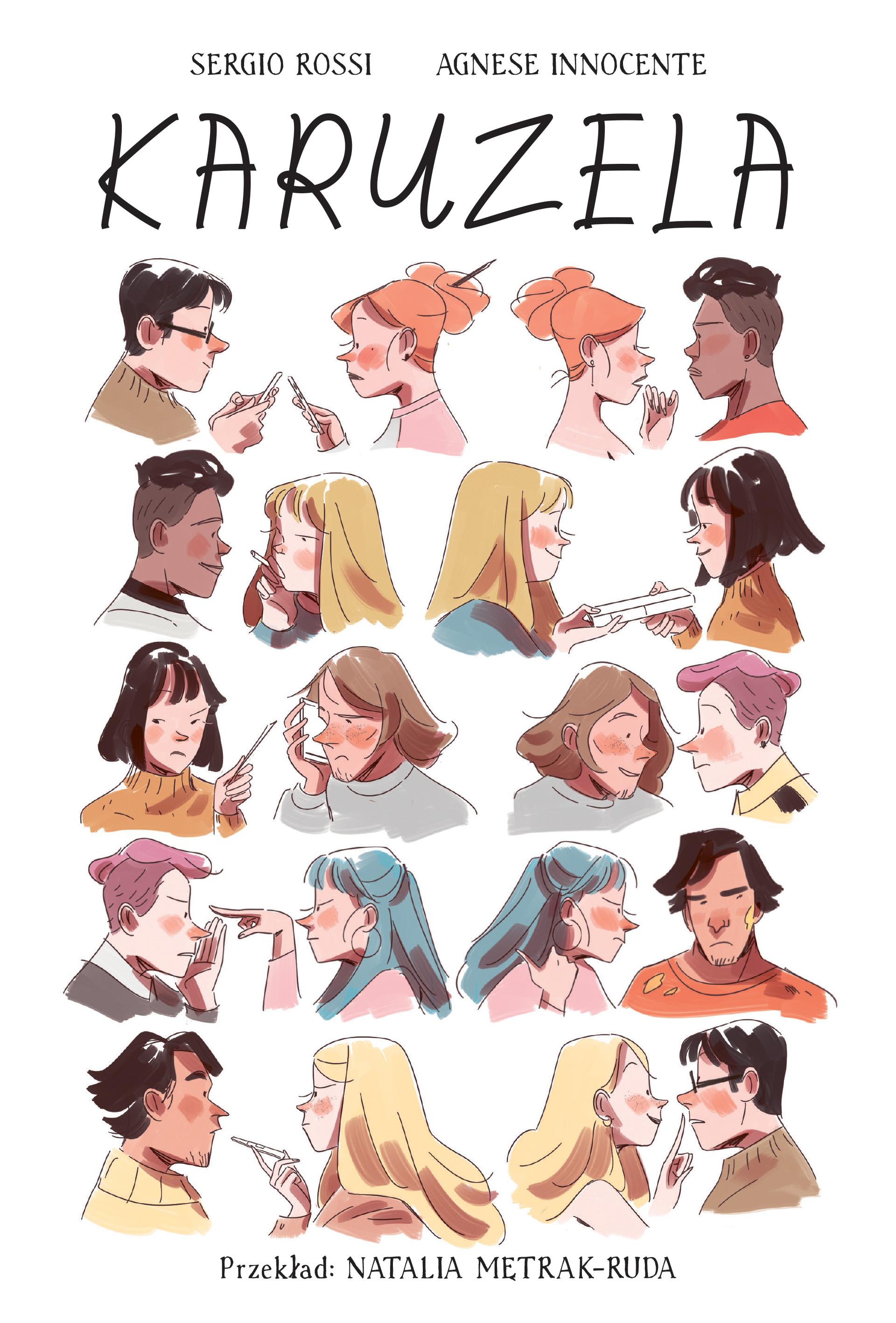 KARUZELA to komiks o dorastaniu we współczesnym świecie, w dobie mediów społecznościowych. Tutaj w centrum znajduje się WhatsApp, za pośrednictwem którego postacie wymieniają wiadomości. Bohaterowie to paczka znajomych, którzy często mają więcej odwagi by coś napisać, zamiast powiedzieć. Cała historia zaczyna się od nieśmiałej Anny, która wysyła wiadomość do Stefano, który jej się podoba, ale boi się zdradzić swoją tożsamość. I w taki sposób sprawa zaczyna się komplikować... Autorzy w zgrabny sposób przedstawili ciąg przyczynowo skutkowy, który z ciekawością śledziłam. Postacie szukają miłości, akceptacji drugiej osoby, czasami wplątują się w kłopoty. Całość podzielona jest na dziesięć odcinków, w których dobór głównych postaci nie jest przypadkowy, a każdy rozdział nawiązuje do poprzedniego i następnego. A w pewnym momencie historia zatacza koło - świetnie to obmyślono. Na początku może się wydawać, że te odcinki pojawiają się nie wiadomo skąd, że panuje tu chaos, ale im dalej w historię, tym bardziej zauważamy, jak bardzo jest dopracowana, a to uczucie chaosu jest specjalnie wykreowane, abyśmy mogli zrozumieć, co dzieje się w głowach naszych postaci.Podobał mi się pomysł na historię oraz jej wykonanie. Kreska ilustratora również warta jest pochwały - w tej powieści graficznej jest cała masa pięknych rysunków.Jeśli lubicie komiksy i historie w stylu coming out of age - o trudach dorastania, podejmowaniu decyzji i popełnianiu błędów młodości, to sięgnijcie po "Karuzelę" i sprawdźcie, jakie zamieszanie może wywołać jedna wiadomość na WhatsApp'ie.