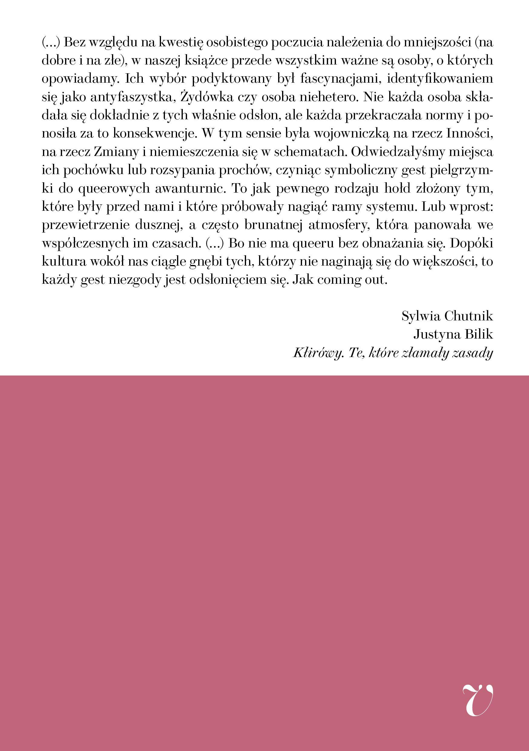 "Kłirówy. Te, które złamały zasady" 15 kobiet, które nie wpisywały się w powszechnie przyjęte schematy! Postanowiły je łamać, pokazując jak ważne jest to, aby zawsze być sobą i walczyć o swoje prawa!! Piętnaście mocnych historii, które motywują do podjęcia działania I życia zgodnie z tym, co dyktuje nam nasze sumienie!! Zgodnie z własnym wewnętrznym ja, które powinno stać zawsze na piedestale naszych priorytetów! Naprawdę warto przeczytać o kobietach, które nie bały się o siebie zawalczyć, wyrazić swojego zdania!
