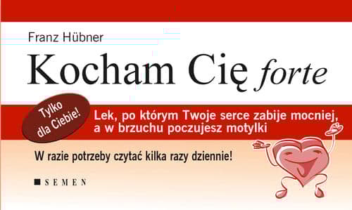 Niezwykła książka-lekarstwo powraca w nowym wydaniu! Kontynuacja serii, która zyskała ogromną sympatię Czytelników, bo jak można nie lubić książki mającej tak szerokie spektrum działania? Kocham Cię forte to niezwykły "środek" dla każdego serca – tego kochanego i kochającego "na zabój" i tego kochającego i kochanego mniej. „Lek” bez możliwości przedawkowania i działań ubocznych. Zastosowanie Szeroką gamę możliwości Kocham Cię forte można testować w ciągu trzydziestu sześciu dni lub w zależności od potrzeby stosować środek w pojedynczych dawkach.