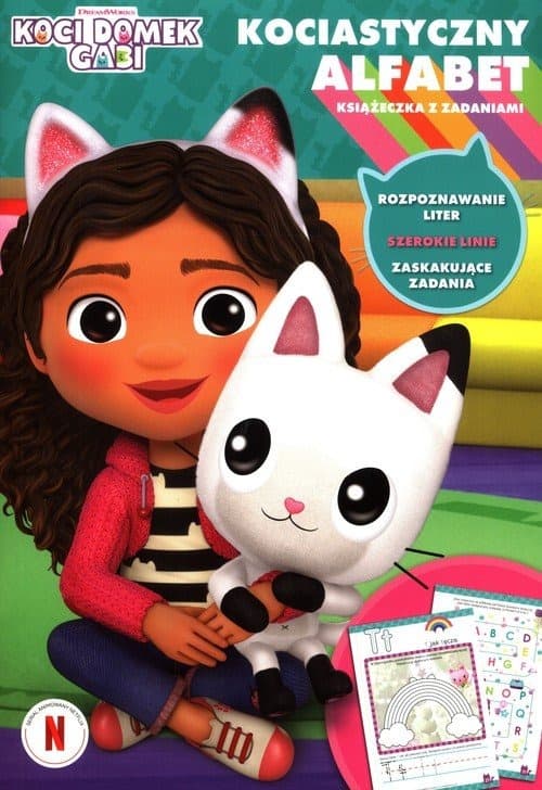 Książka na bazie popularnego serialu dla dzieci "Koci Domek Gabi"; książka edukacyjna z zadaniami do rozwiązywania, która wspiera w nauce alfabetu i pisania liter wspomaganie nauki alfabetu; ćwiczenie pisania liter; wspomaganie chwytu narzędzia pisarskiego; nauka przez zabawę nauka przez zabawę, kolorowe ilustracje z ulubionego serialu.