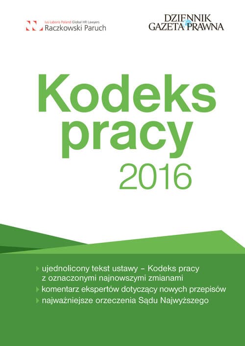 ujednolicony tekst ustawy – Kodeks pracy z oznaczonymi najnowszymi zmianami komentarz ekspertów dotyczący nowych przepisów najważniejsze orzeczenia Sądu Najwyższego Nowe wydanie komentarza do Kodeksu pracy, uwzględniające najważniejsze zmiany w przepisach prawa pracy, które miały miejsce na przestrzeni ostatniego roku. Komentarz składa się z trzech części i obejmuje kolejno: Komentarz do zmian w przepisach, które weszły lub wejdą w życie w 2016 r., Komentarz do najważniejszych (w ocenie autorów) orzeczeń Sądu Najwyższego wydanych w 2015 r., o przełomowym znaczeniu dla stosowania przepisów prawa pracy, Praktyczne informacje dla przedsiębiorców dotyczące najbardziej aktualnych problemów z zakresu prawa pracy, w tym w szczególności dotyczące ZUS.